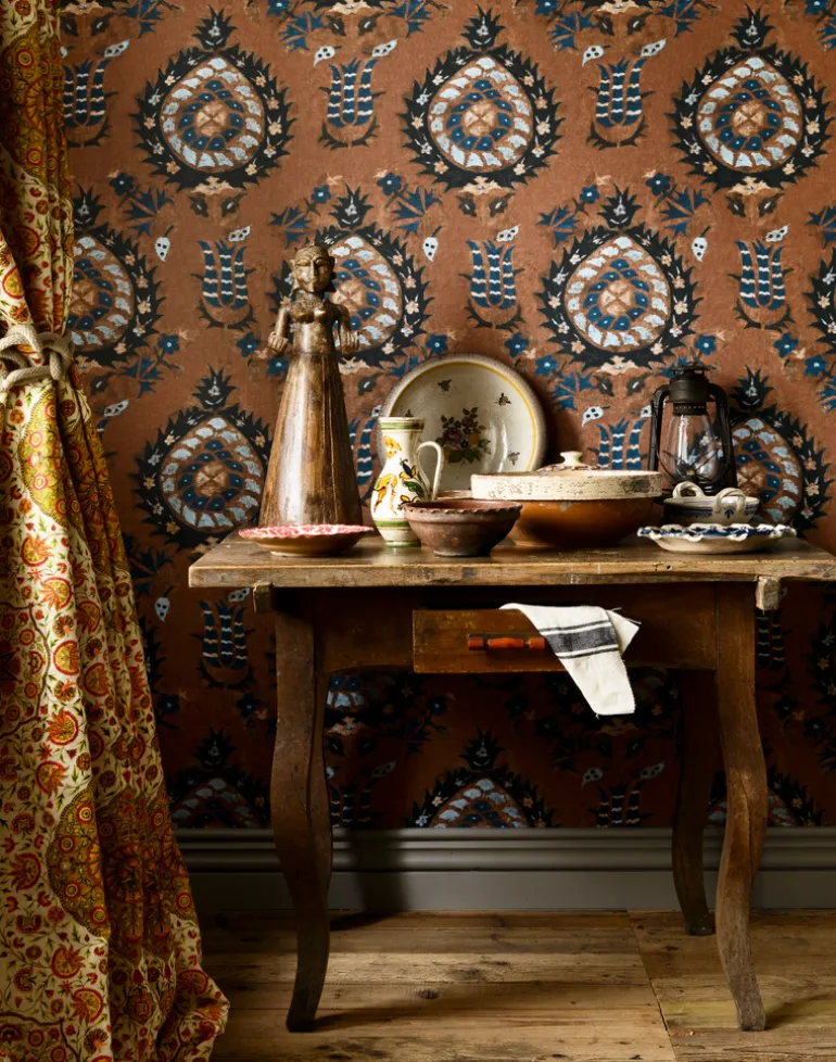 Earth tones and signature nuances of Transylvania-blue flourish together in a warm, comforting design that brings back memories of precious beginnings. Blossoming from the dawn of time, subtle stem and bud shapes gain confidence becoming a statement pattern of our Roots collection.