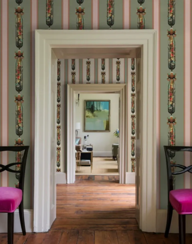 The Flower Bomb wallpaper brings a touch of black humor to the formality of a Georgian striped wallpaper. The design remixes a stylized bomb with classical motifs and in doing so reminds the viewer that the extremes of human existence – love and hate, war and peace, light and darkness – so often go hand in hand.