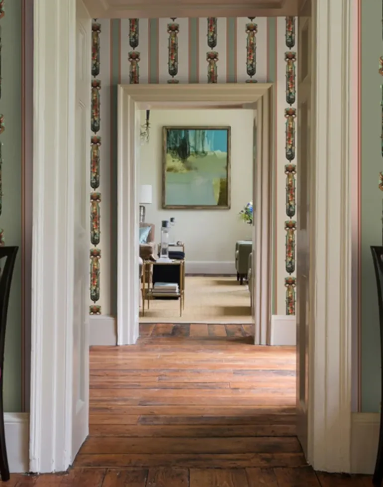 The Flower Bomb wallpaper brings a touch of black humor to the formality of a Georgian striped wallpaper. The design remixes a stylized bomb with classical motifs and in doing so reminds the viewer that the extremes of human existence – love and hate, war and peace, light and darkness – so often go hand in hand.