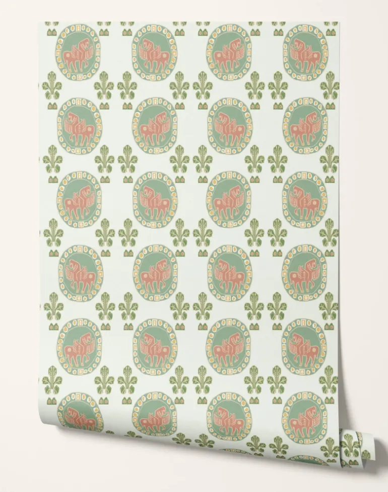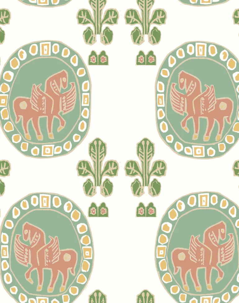 This fanciful design features the fabled winged horse prancing along, inviting you to make up your own story as the inspiration arises. The motif offers a starting point, and you can do the rest. What does the Pegasus bring to mind for you? Available in either navy and pink or peach and blue colorways. Transform your home into a stage where reality and imagination merge.