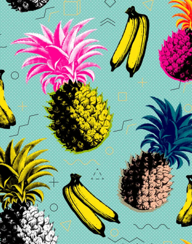 Bright pink, black, and yellow illustration on aqua blue background