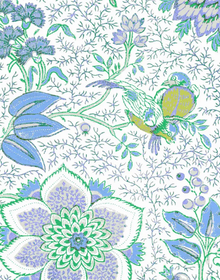 A light, bright floral wallpaper based on a 18th Century French textile which reminds of summerhouse escapes and holidays. This wallpaper has a refined and feminine indienne style in a playfully floral combination that is uplifting, feminine and sophisticated.