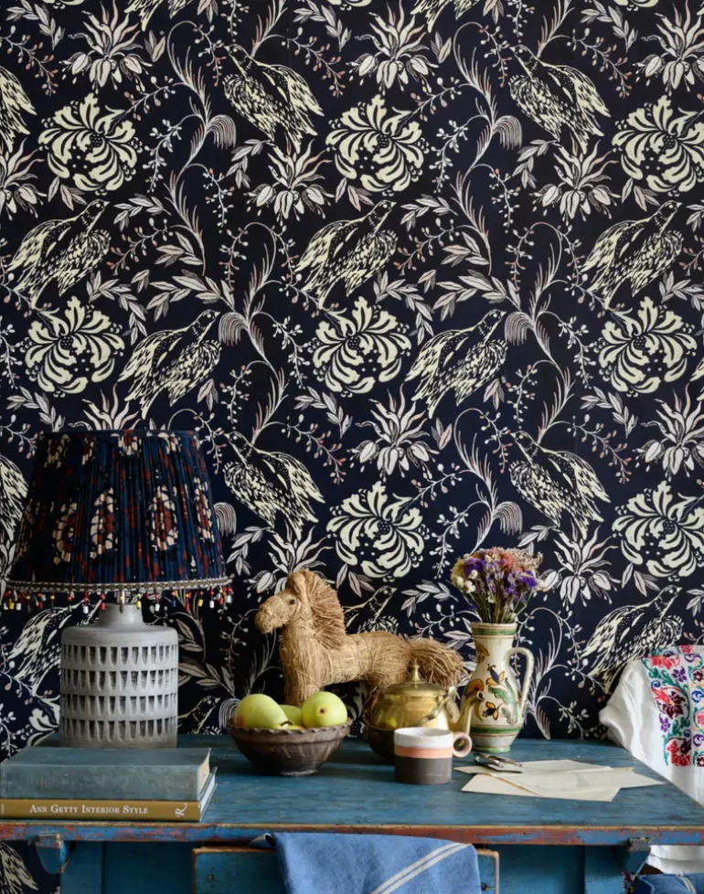 Stemming from old embroidery patterns and having flowers and birds motif as source of inspiration, THE FOLK EMBROIDERY wallpaper retraces the richness in patterns found in our ancient history. Details are fine lined in four colour options: crimson, fern green, indigo and tobacco.
