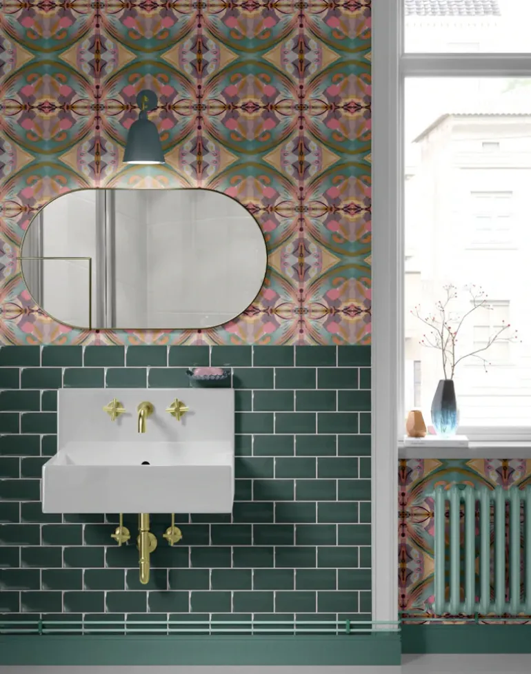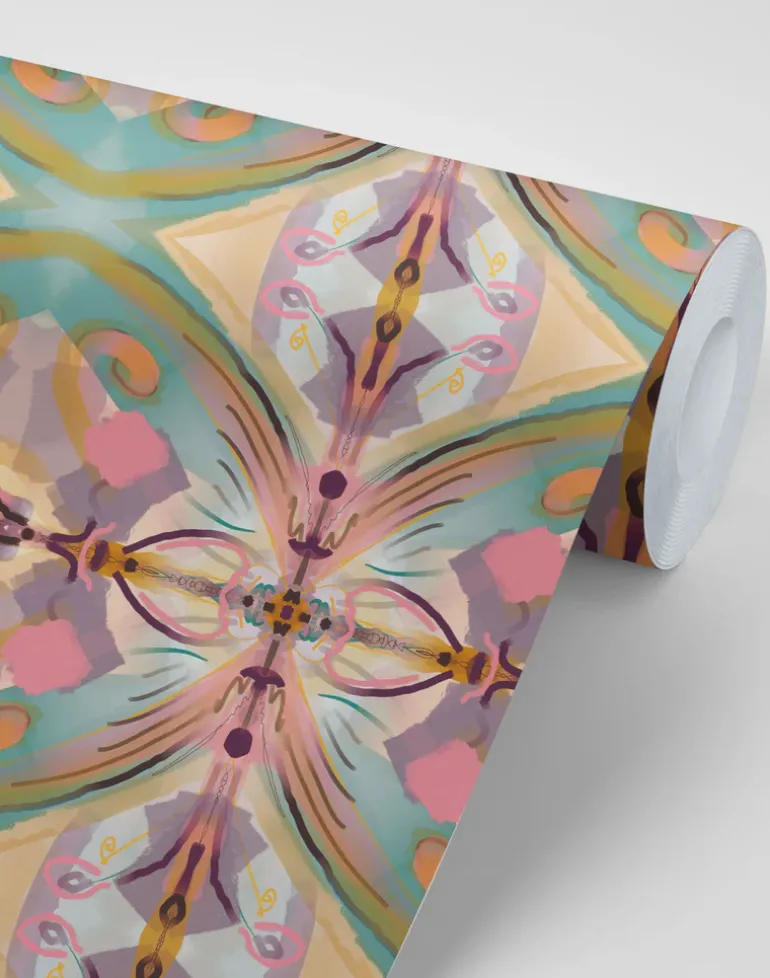 This beautiful hand drawn design is inspired by all the wonderful tiles in Portugal. A gorgeous palette of turquoise, mustard and pink. This stunning design can be used for a feature wall or an entire room and bring a sense of color and freshness into any room.