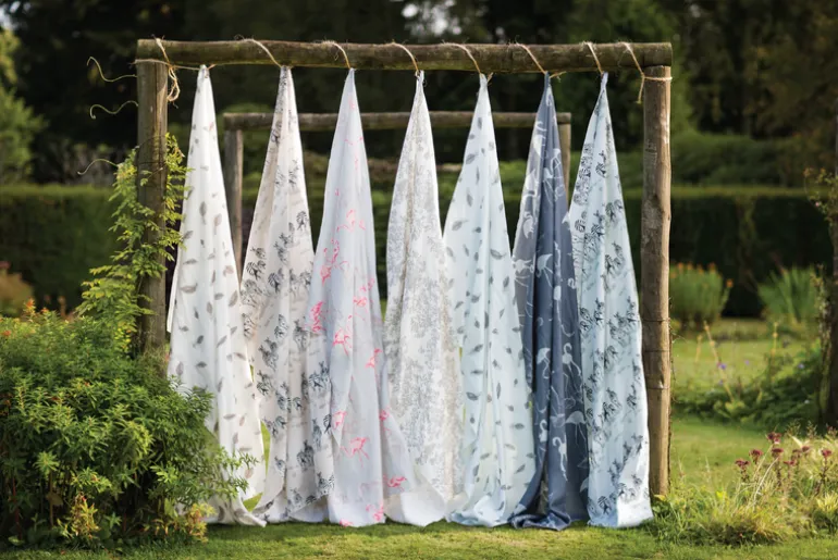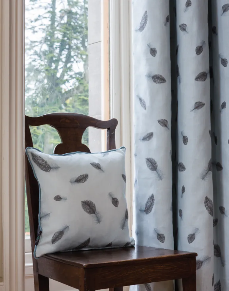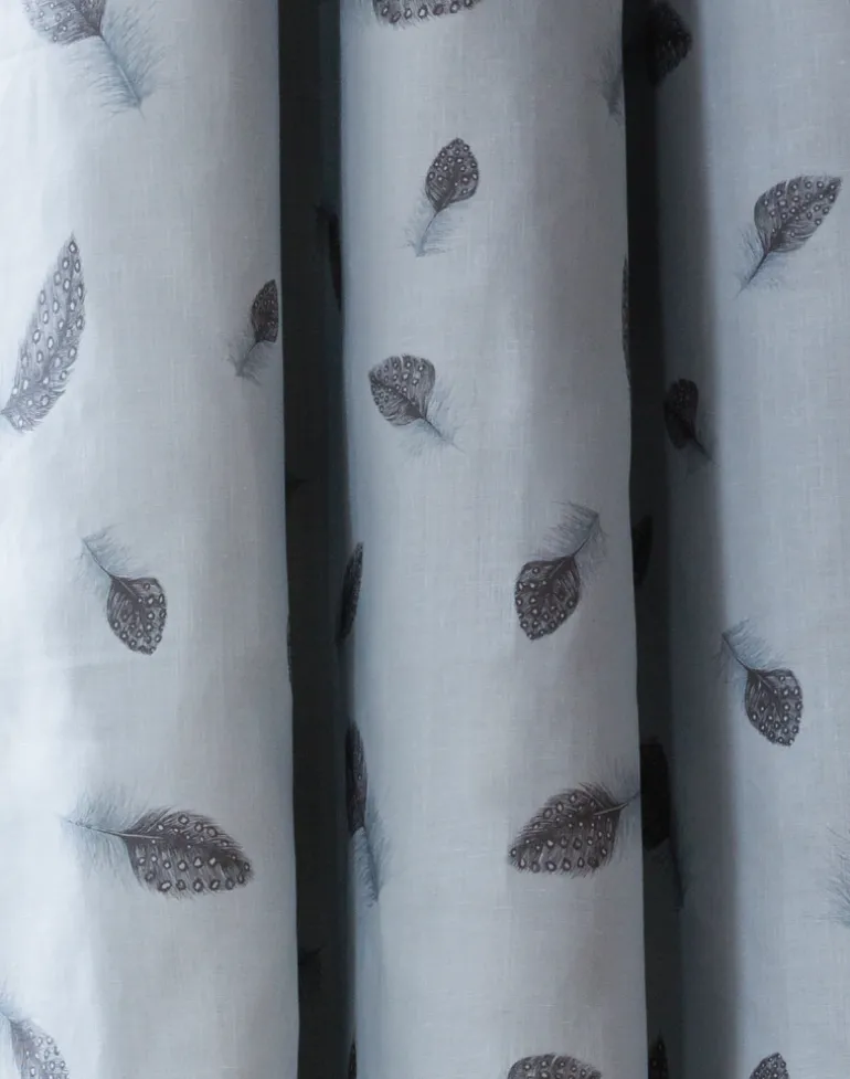 This design consists of different sized Guinea Fowl feathers, cascading down the fabric. The elegant and gentle design structure is calm and harmonious and summarizes this whole collection in terms of detail, tone and meaning.