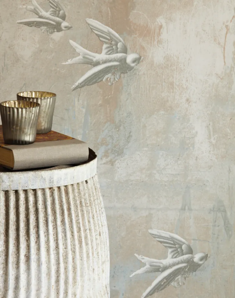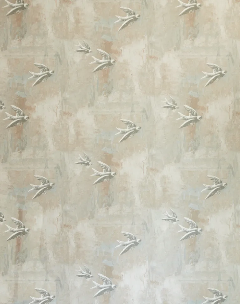 A modern take on the ancient art of fresco painting. The beaten up plaster wall complete with paint marks, old nails and graffiti-style scratches (such as ‘1963’ etched into the brickwork) is softened by decaying grey swallows flitting across the paper.