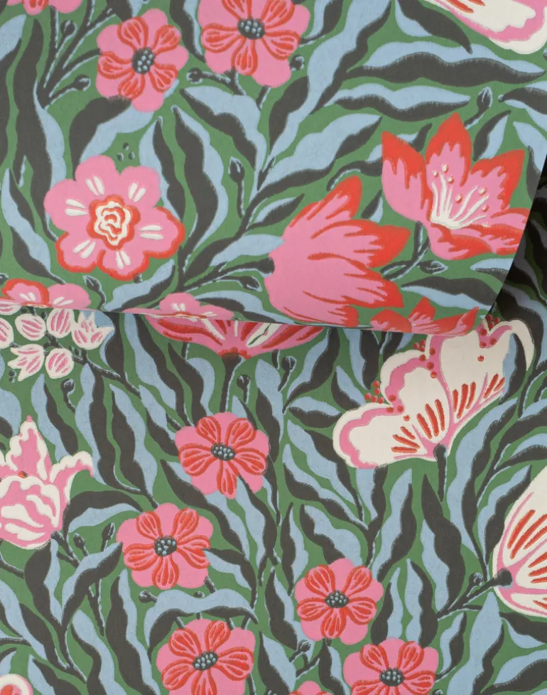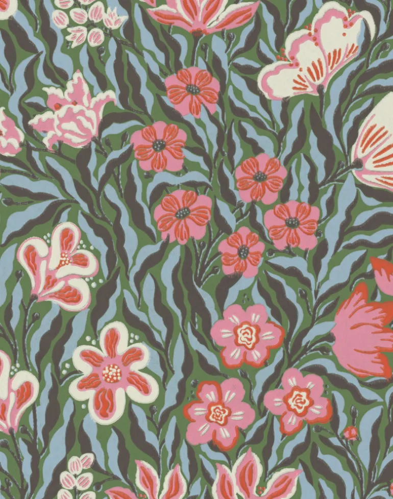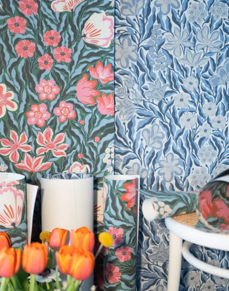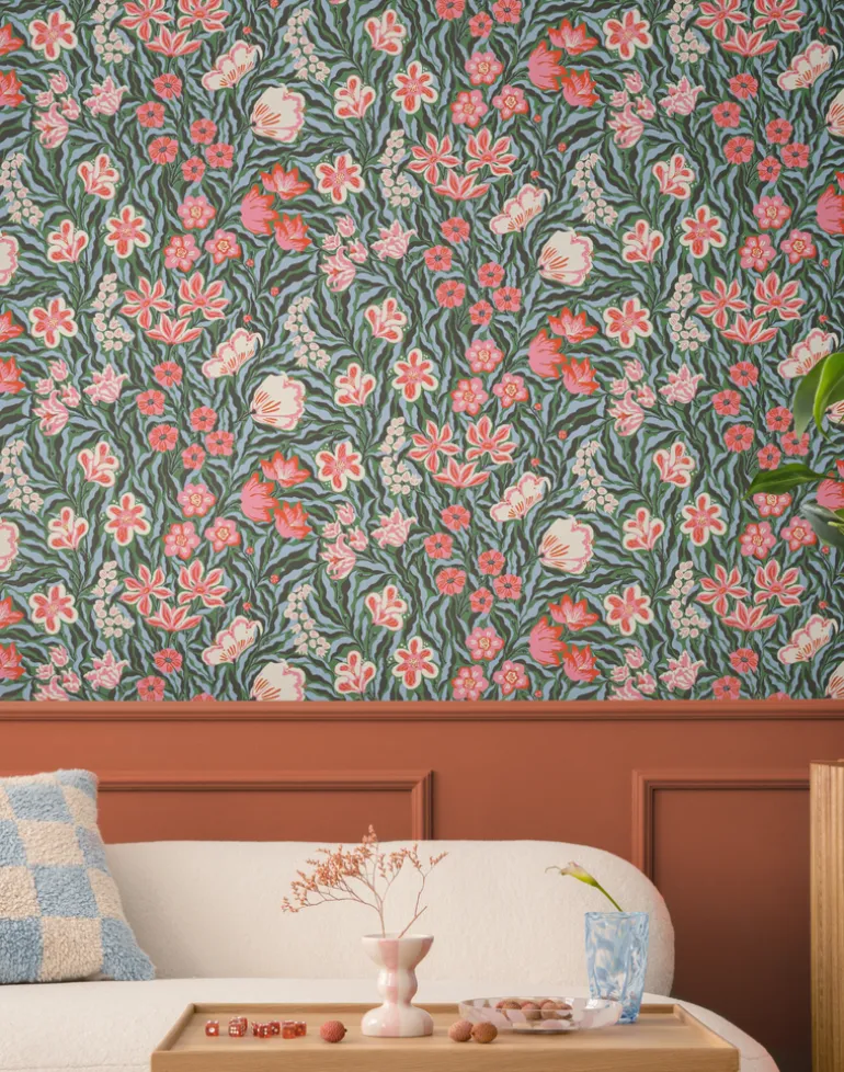 Frodas Primavera is a vibrant pattern featuring flowers in soft, organic, dancing shapes. This wallpaper evokes the feeling of a blooming early summer garden. Its trendy color palette and a hint of retro awaken spring feelings and create an enveloping atmosphere. This dense, florally rich pattern offers a perfect indoor oasis on grey days. An invigorating pattern that uplifts and energizes any space.