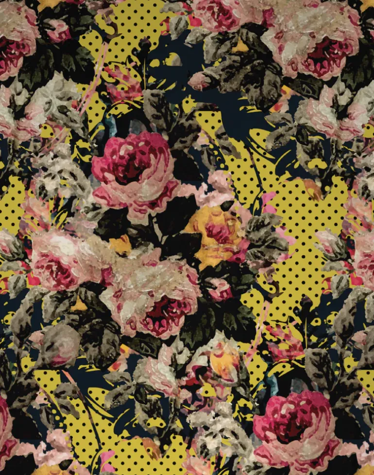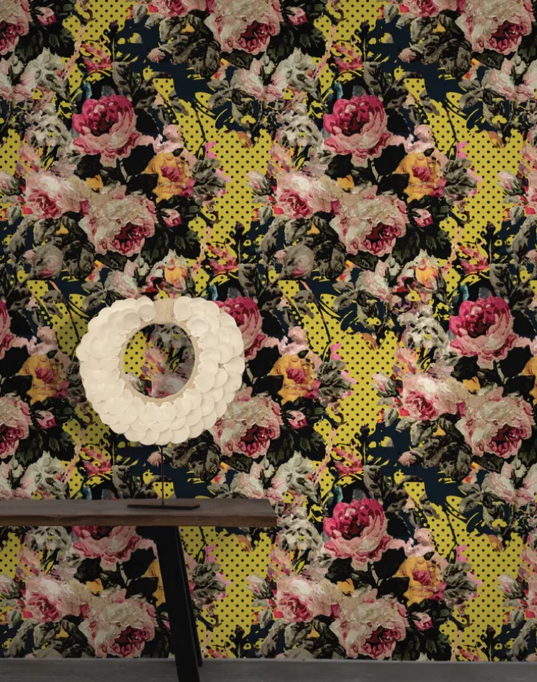 A joyous juxtaposition of handpainted roses and pop art motifs creates this thoroughly modern floral wallpaper. Its fresh modern colors are the perfect balance to the vintage florals, inspired by vintage rococo patterns exposed during a renovation project.