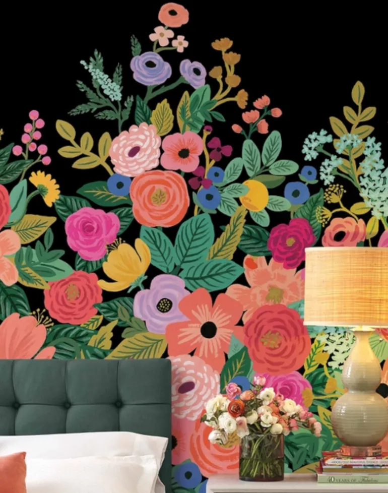 Create a statement wall with the colorful blooms of our Garden Party mural. Our classic floral is lush and full at the bottom, and delicately tapers off as it grows up the wall. The mural is digitally printed, and covers a 5.5′ × 11′ wall.