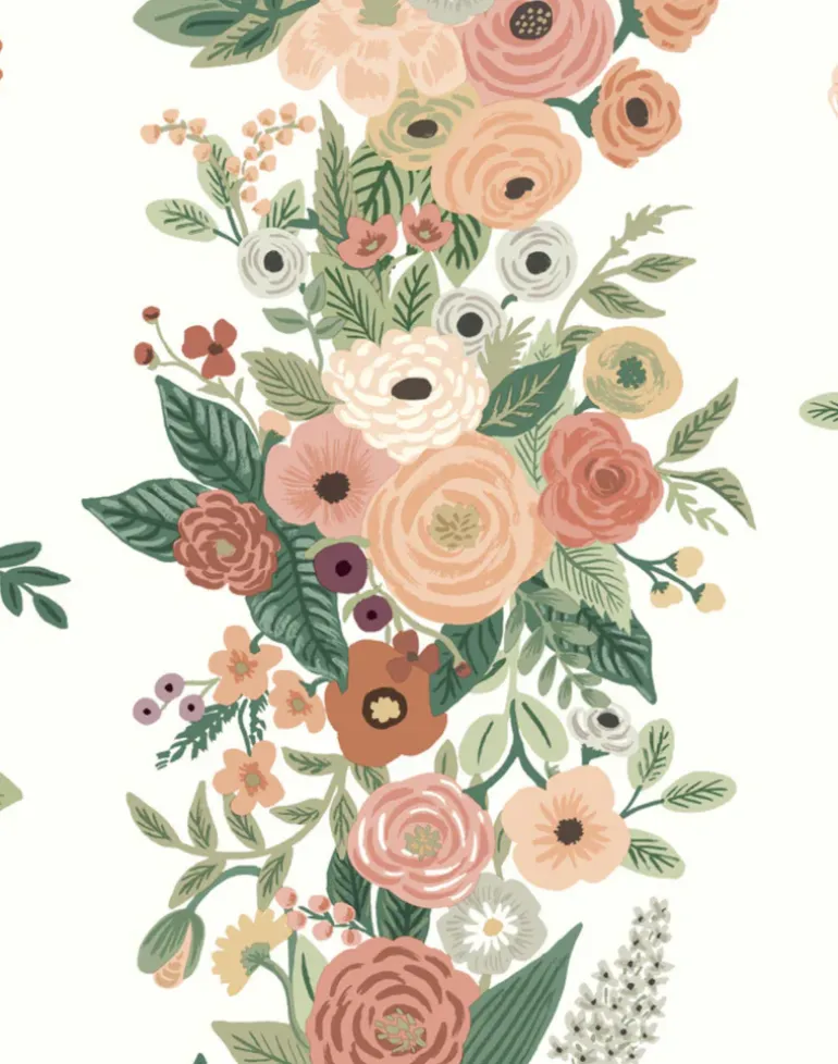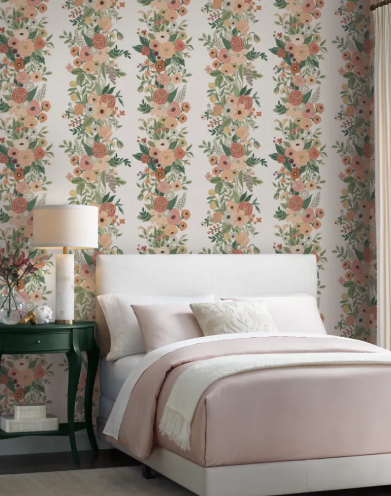 Our signature Garden Party florals, here presented in an organic, vertical stripe that is classic and feminine. This wallpaper is gravure printed and comes in 27 inch rolls with a 20.5 inch repeat.