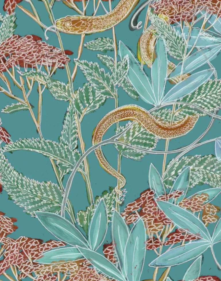 Garden Snake is a beautiful boutique wallpaper design that features a hand-sketched scene from nature with watercolor. The design depicts the delicate interplay between flora and fauna, showcasing a snake winding its way through leaves and vines with precision and grace.