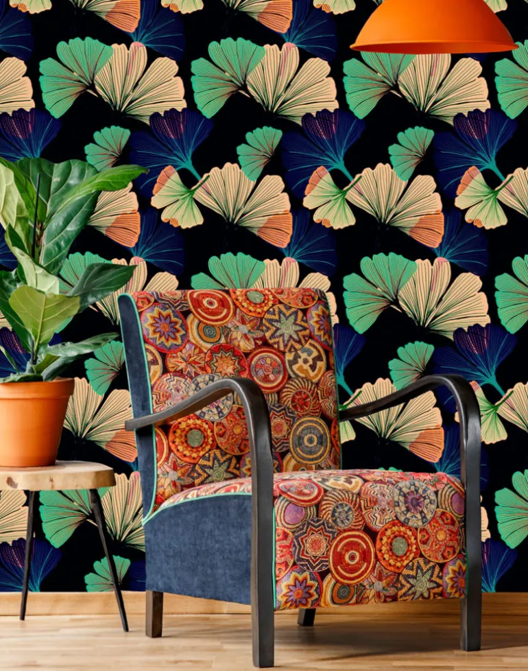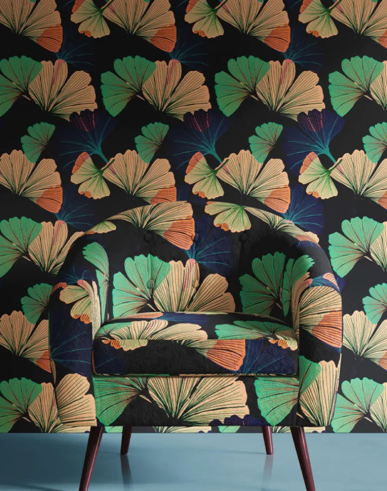It has a gorgeous palette of black, indigo, mint green and coral. It looks amazing as a feature wall or in an entire room to bring a sense of color and freshness.