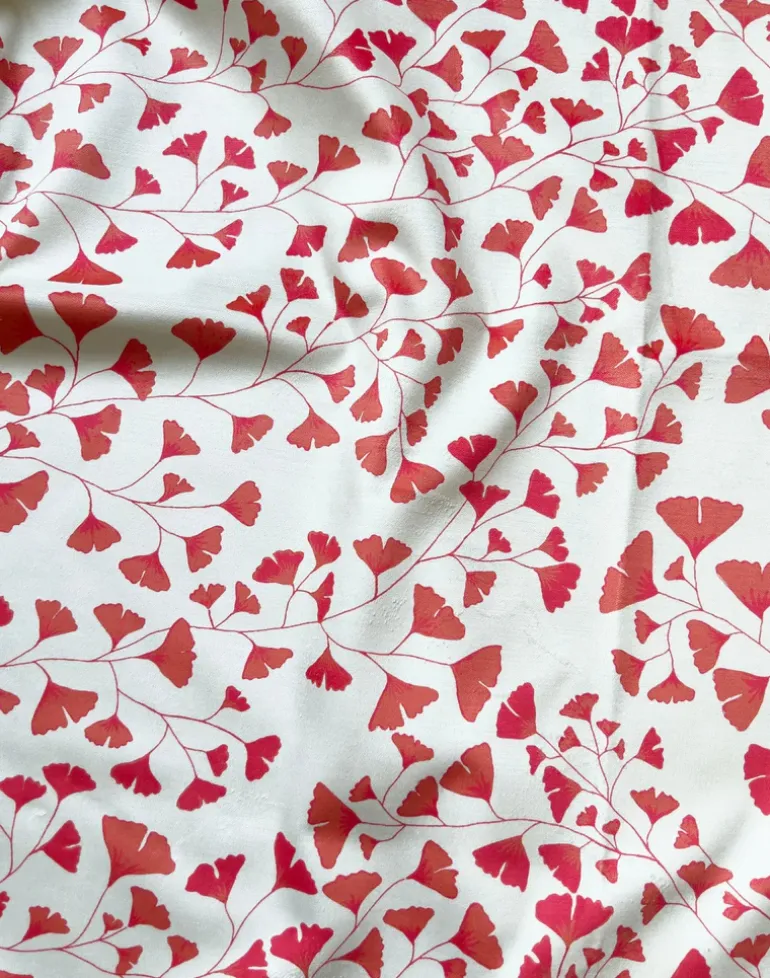 Gingko Leaves is an illustrative design portraying decorative fan shaped gingko leaves and the movement of the vines draw the eyes in this lustrous fabric suitable for drapery and upholstery. Available in 4 color ways.