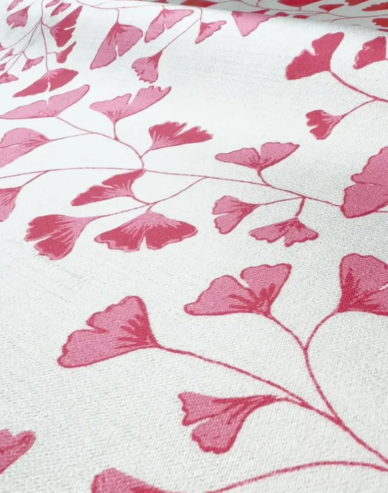 Gingko Leaves is an illustrative design portraying decorative fan shaped gingko leaves and the movement of the vines draw the eyes in this lustrous fabric suitable for drapery and upholstery. Available in 4 color ways.
