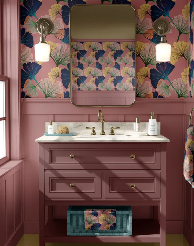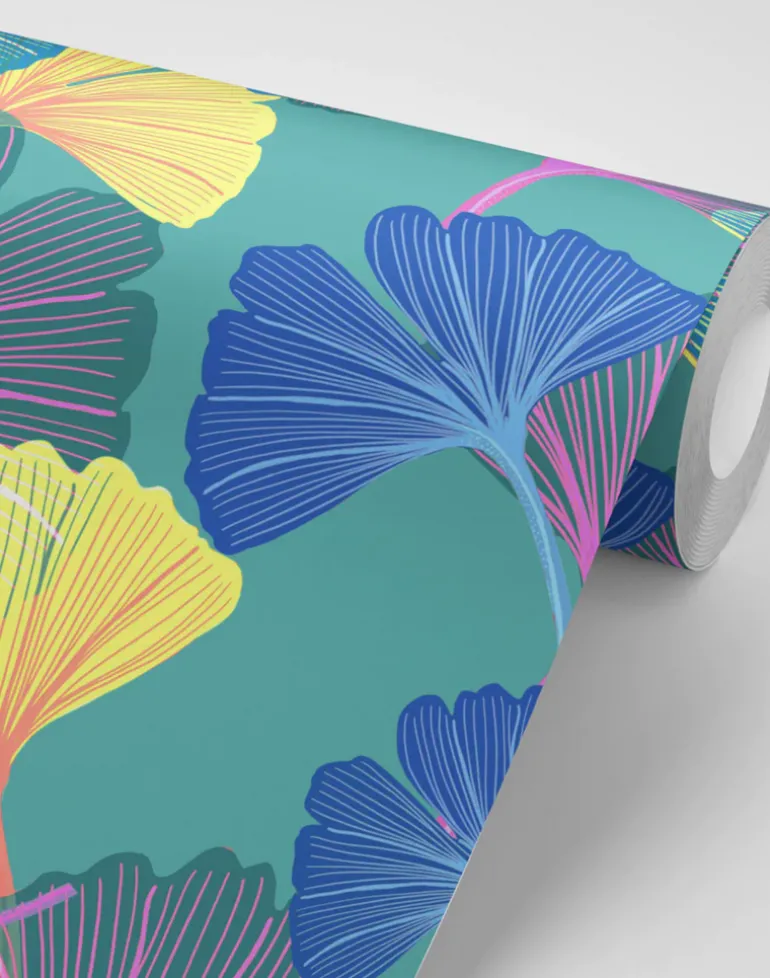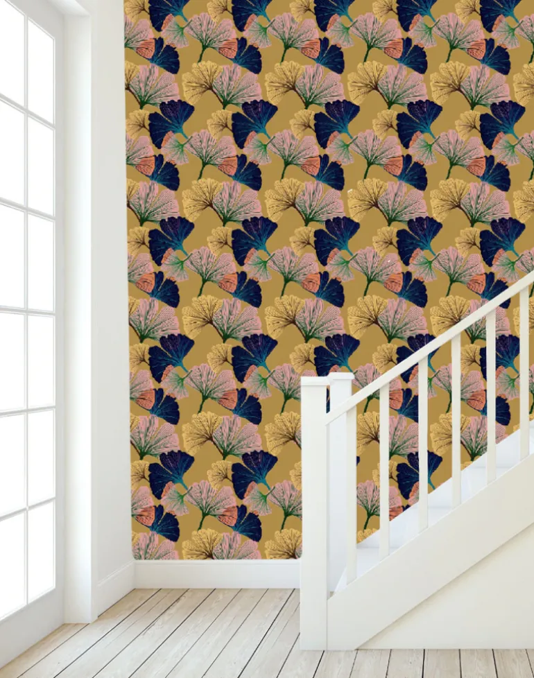 It has a gorgeous palette of warm pink, green, indigo, pale pink and lemon yellow. It looks amazing as a feature wall or in an entire room to bring a sense of color and freshness.