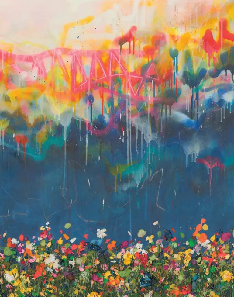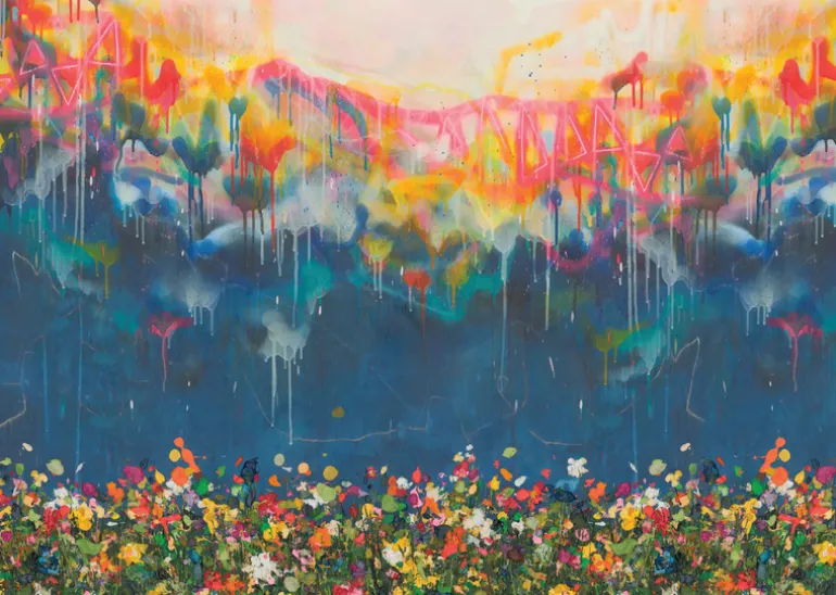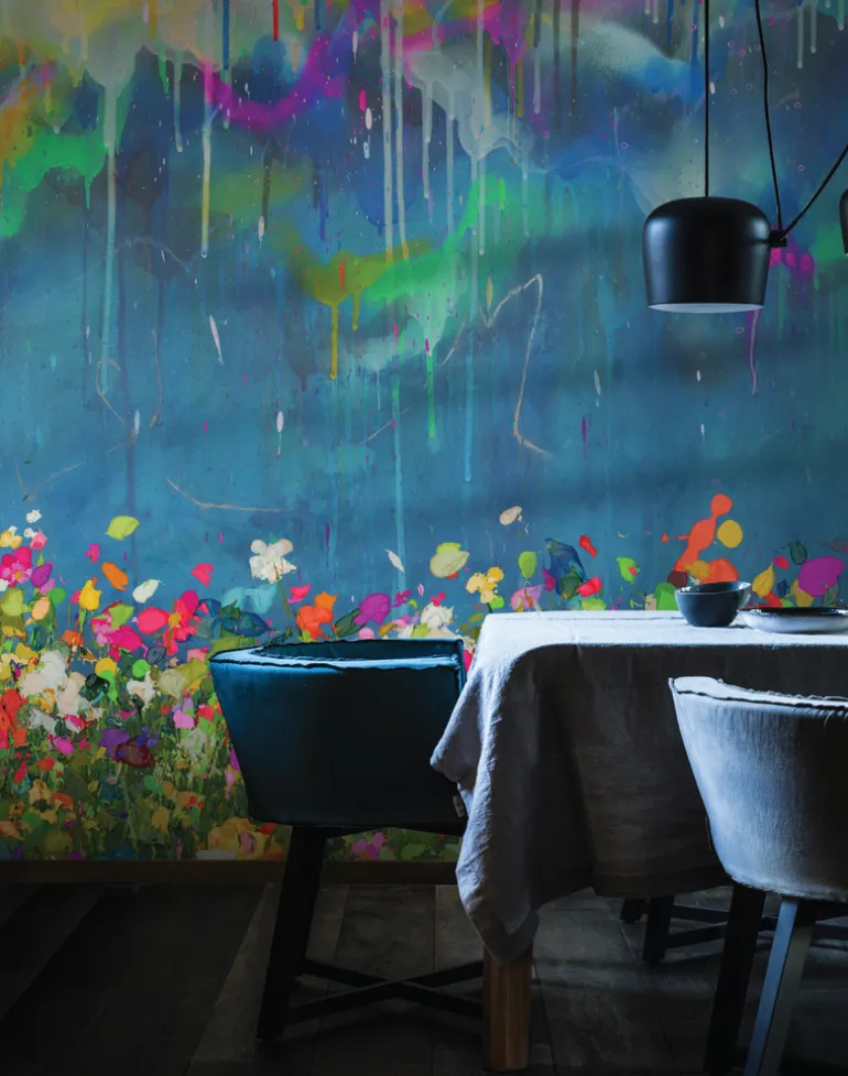 Glowing Shards is work by British painter Lee Herring. It displays his trademark mixing of media, with spray paints, markers and acrylic paints used to create layers of textured backdrops. The result is a stunningly modern meeting of florals with graffiti styling: a true centerpiece wallpaper mural. In grey, the Glowing Shards wall mural creates a juxtaposition between soft grey and vibrant florals.