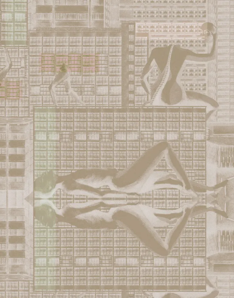 Inspired by idealised dreams and fears of the future from our recent past, aliens lurk in concrete utopias. Goldfinger Aliens wallpaper depicts mostly dismembered aliens lounging on the fabulous brutalist architecture of Erno Goldfinger. The future is yesterday!
