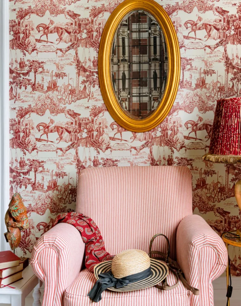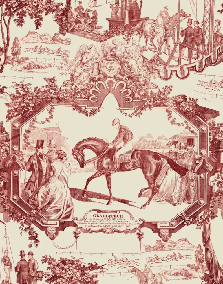 Saddle up for the race of your life with the GRAND PRIX, a wallpaper drawing influence from French Toile de Jouy pattern with a sporty, equine twist. Don your jewels and finery head to the racecourse – join the spirited crowd, converse with the jockey, find a lucky horseshoe, or place a bet or two in this lively illustrative print, where the hand drawn merges true to life realism with a satirical, cartoon-esque character. Printed in a single color, choose from either a soft green which heightens the leafy, rural setting or rich red on a warm white backdrop for a taste of traditional English country life.