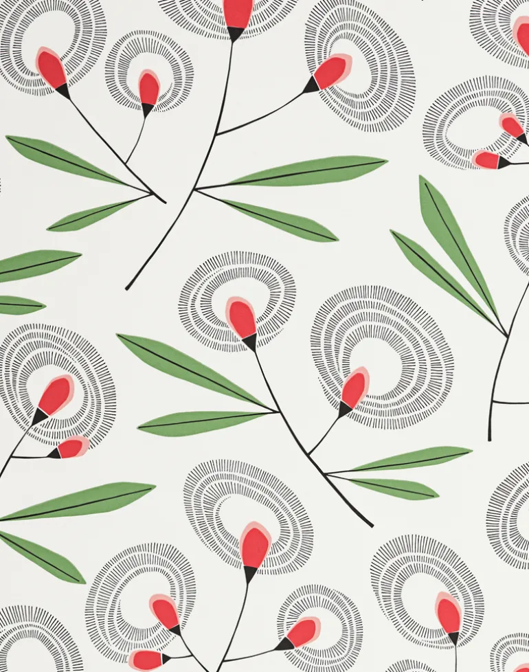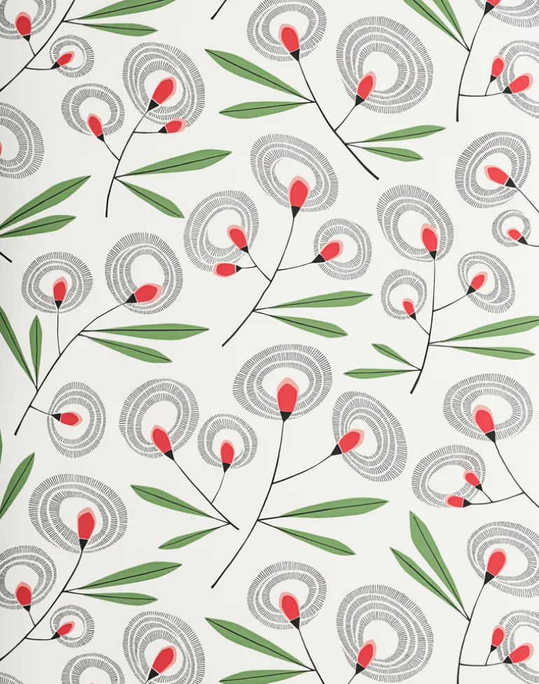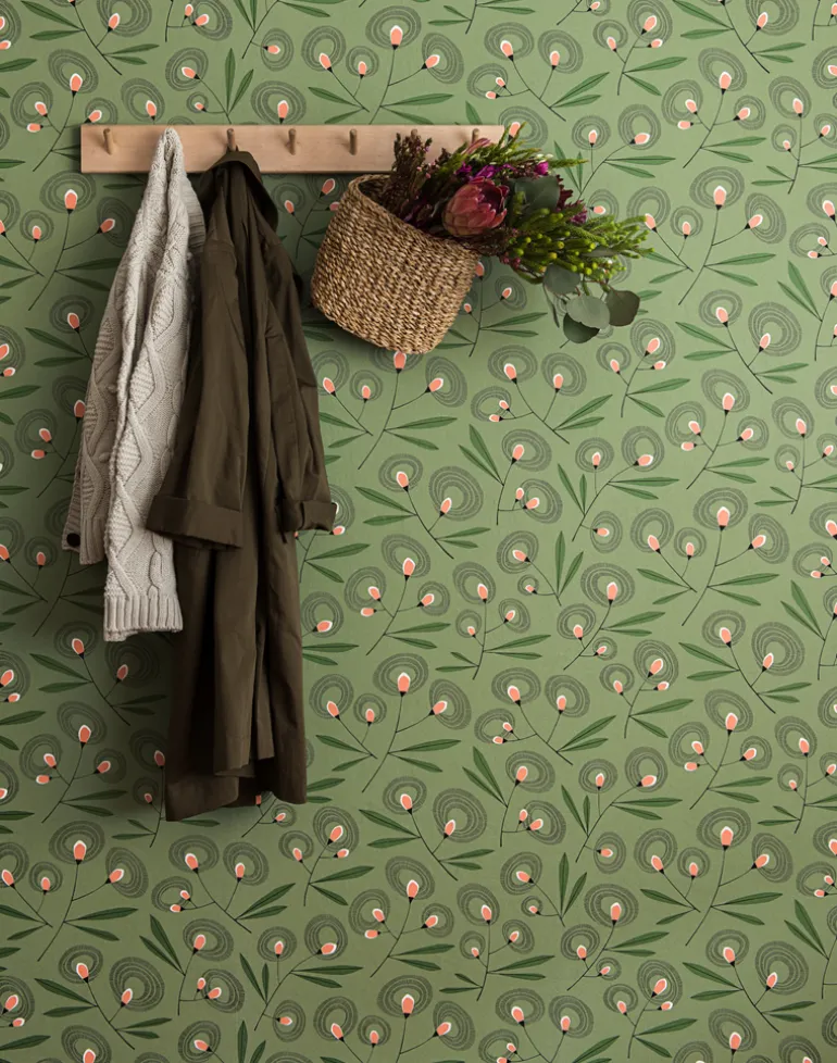 Inspired by the Australian Gum Blossom tree and its firework-like blooms, these flowers don’t have petals but instead offer an explosion of stamens, providing plenty of nectar for bees, other pollinators and nectar-feeding birds. Available in a charming palette of sage, soft blues and a neutral white with pops of berry and green, this design is perfect for those looking to add some character to their walls.