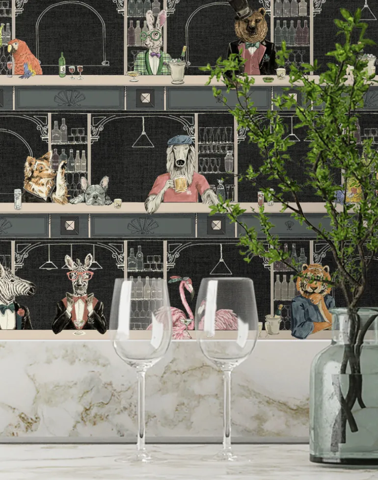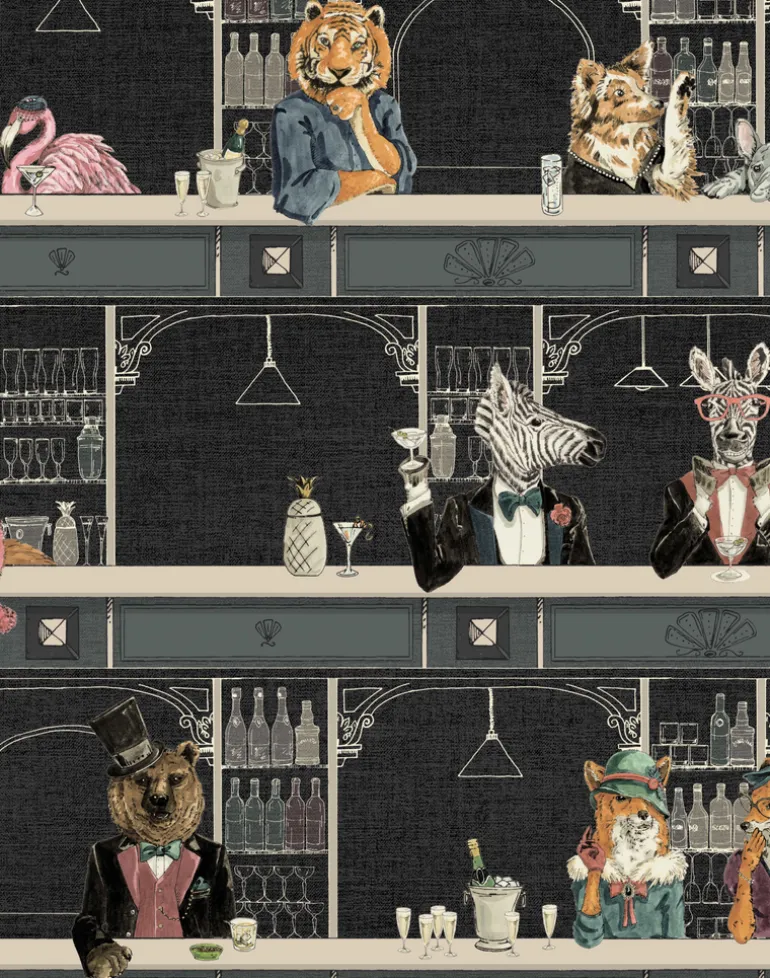 Introducing the luxurious and playful Happy Hour wallpaper by Brand McKenzie. A cocktail bar where animals such as lions, parrots, dogs, and flamingos dress up as humans and indulge in a delightful drink. This exquisite wallpaper perfectly captures the essence of luxury and fun, bringing a touch of playfulness to any room. Perfect for cocktail lovers and animal enthusiasts alike, Happy Hour adds a sense of whimsy and charm to your walls. Transform your space with this stunning and unique design today.