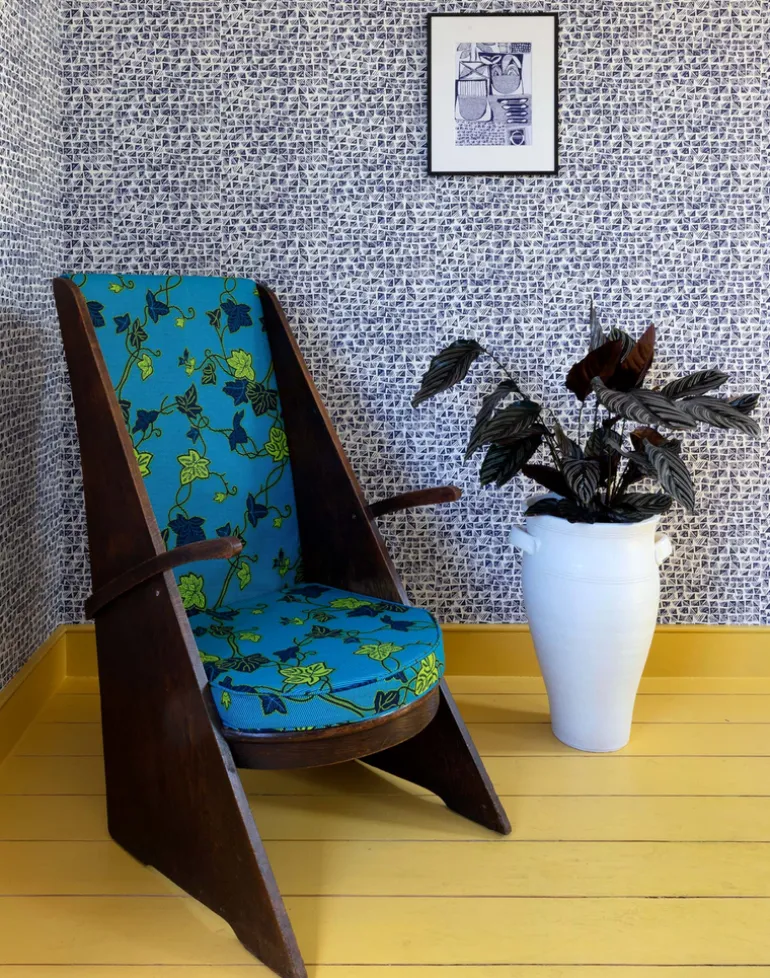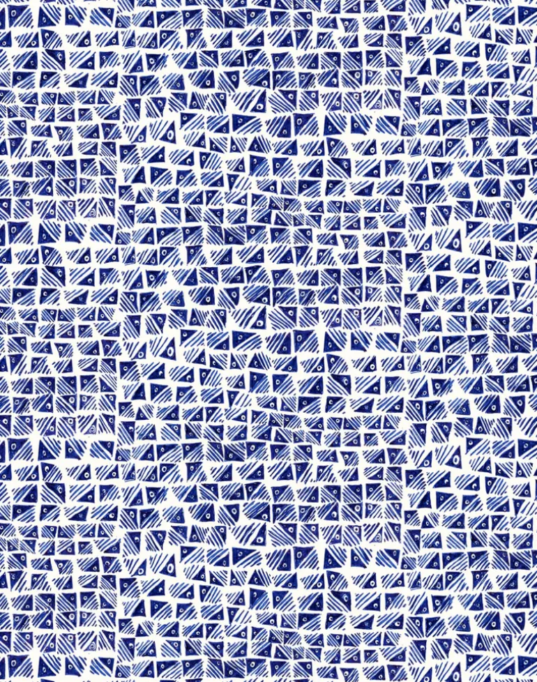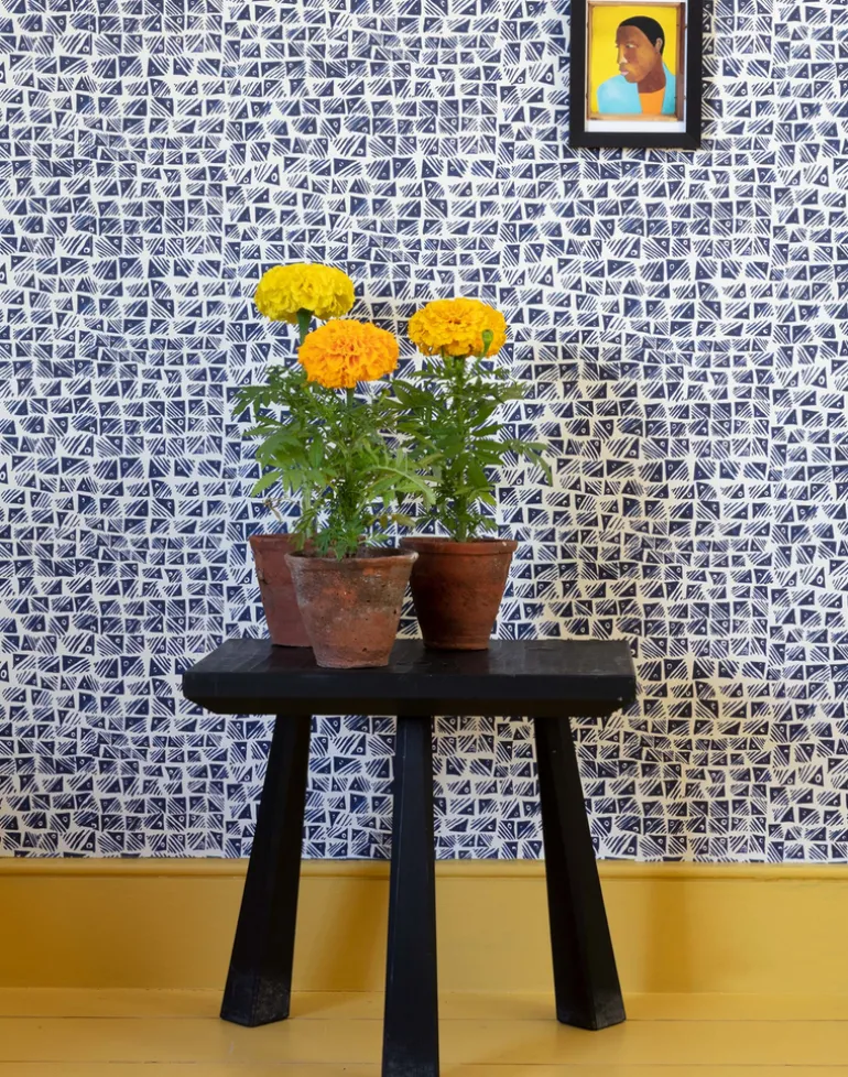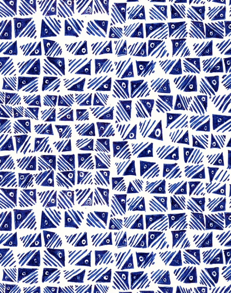 To hatch is to be born, to make a plan, to bring into being. This wallpaper was hatched from Abi’s personal and historical connection to Nigeria and to adire fabrics. Adire is the Yoruba word for ‘tie and dye’ textiles. Traditionally, they are made and worn throughout the Yoruba region of Nigeria. The indigo-dyed cotton is decorated using a resist-dyeing technique to create striking, repeating patterns in blue and white. At the bottom of each adire design you can usually find the artist’s signature, as each textile is a unique artwork. The random, hand-drawn patterns of Hatch pay homage to this tradition whilst allowing you to personally interpret the different shapes. Through the liveliness of its mark-making, this wallpaper paints the life story of the mark-maker and her home.