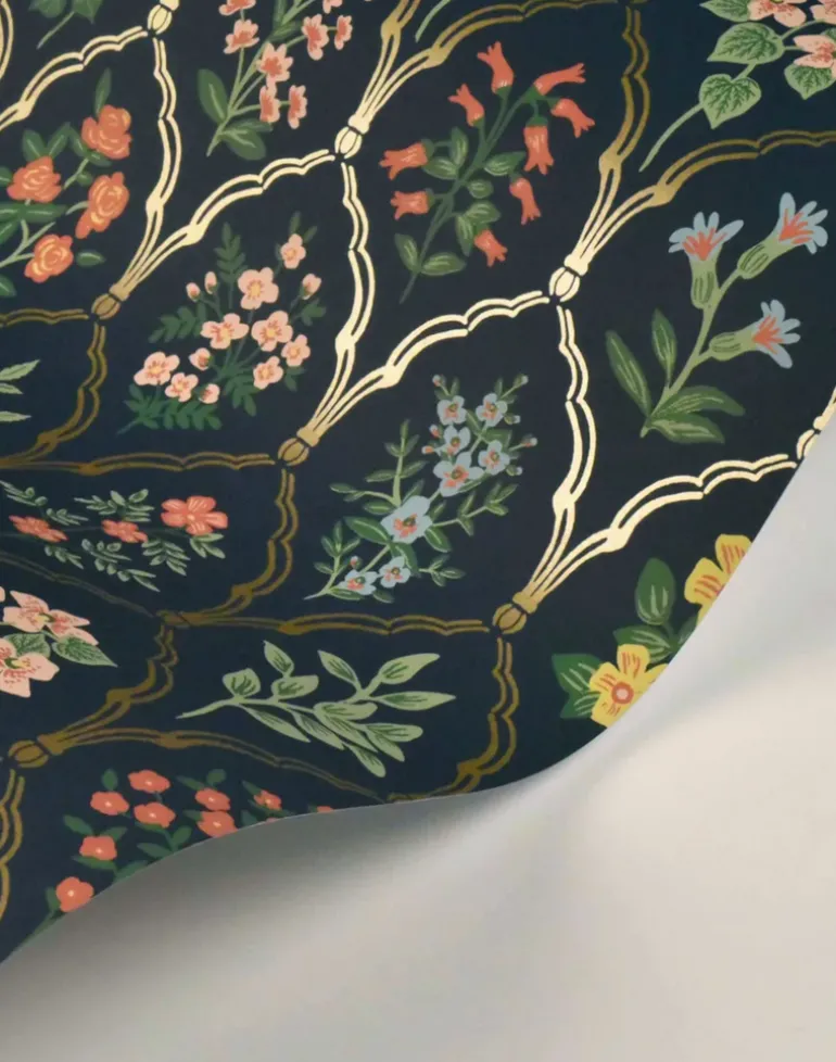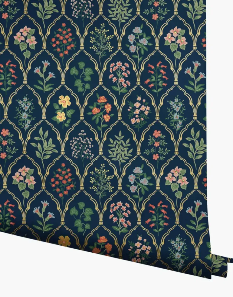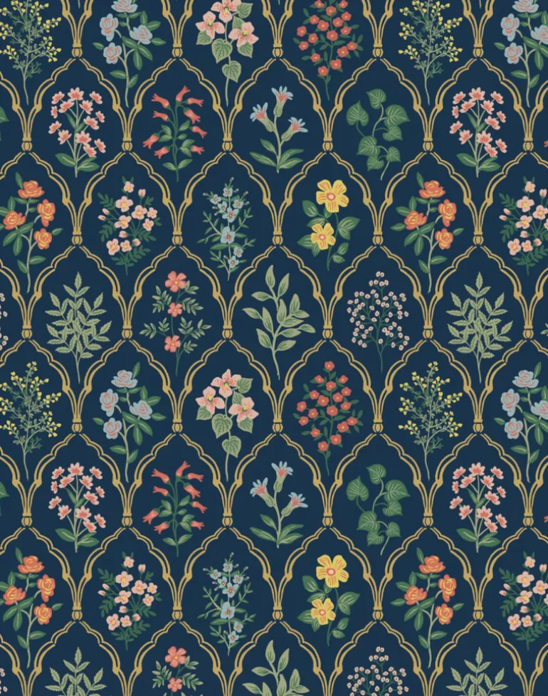 Hawthorne features sprays of assorted flowers standing under delicate arches that create a botanical grid with a vintage feel. This wallpaper is screen printed and comes in 27 inch rolls with a 25.25 inch repeat.