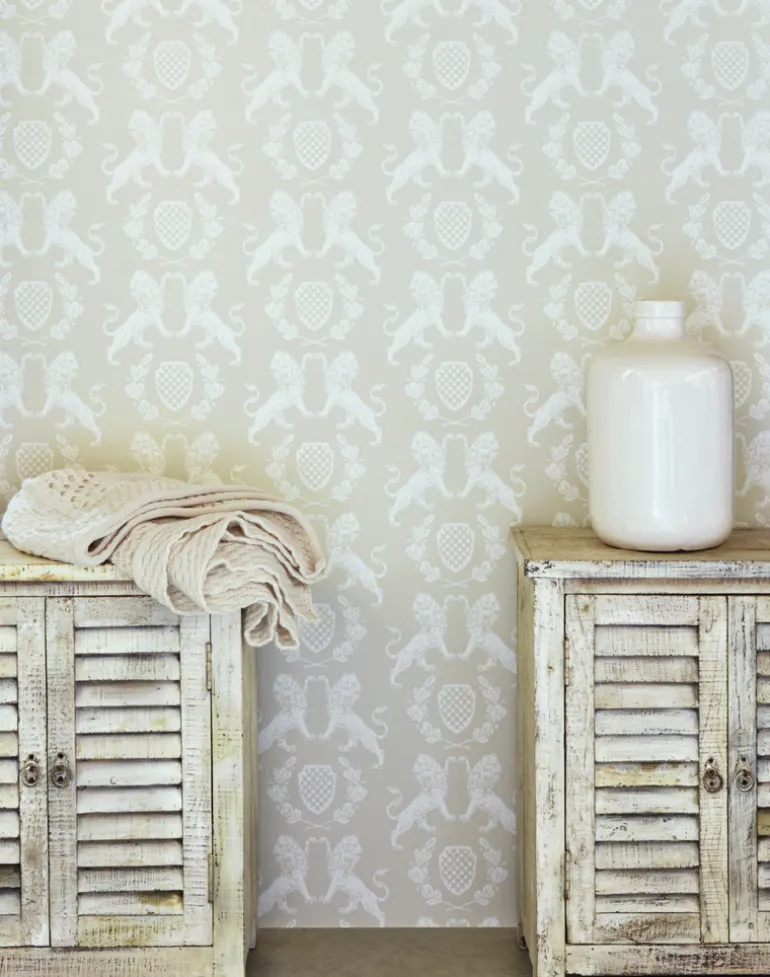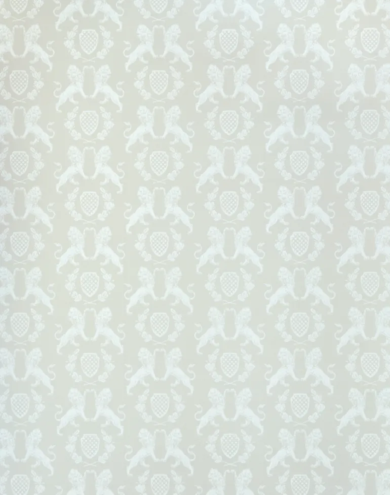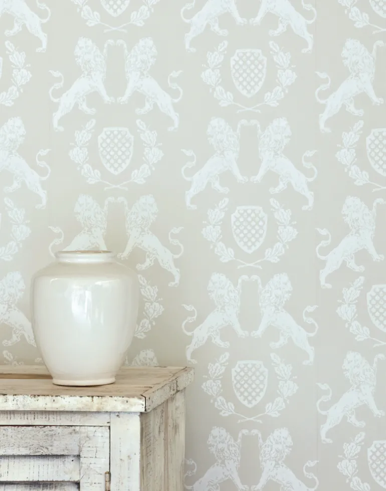 A textural heraldry motif featuring statuesque lions, shield, and oak-leaf wreath, surface printed for a beautiful hand-stamped finish.