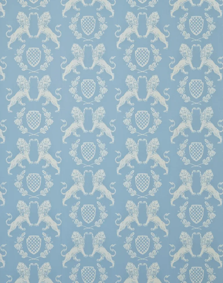 A textural heraldry motif featuring statuesque lions, shield, and oak-leaf wreath, surface printed for a beautiful hand-stamped finish.