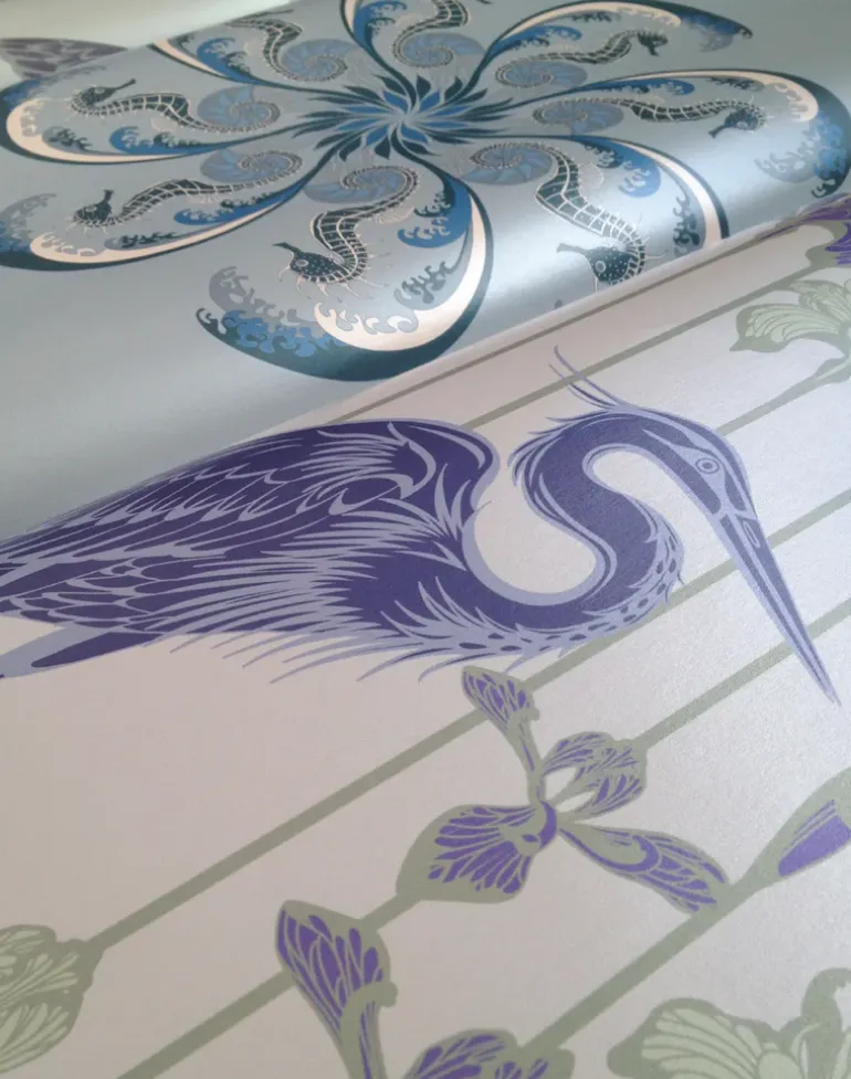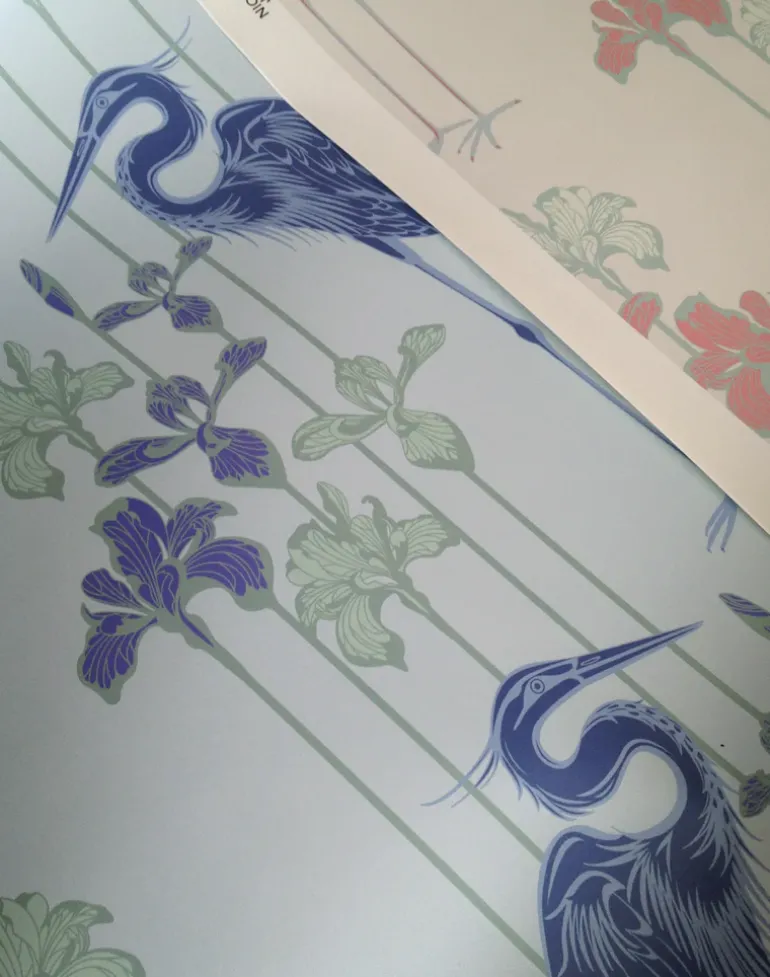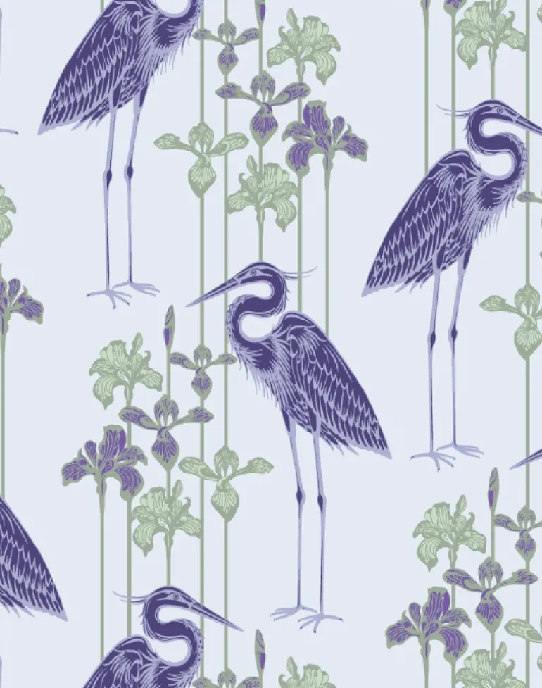 The Heron wallpaper features great blue herons standing with irises in the background.