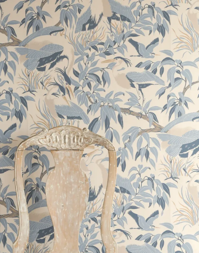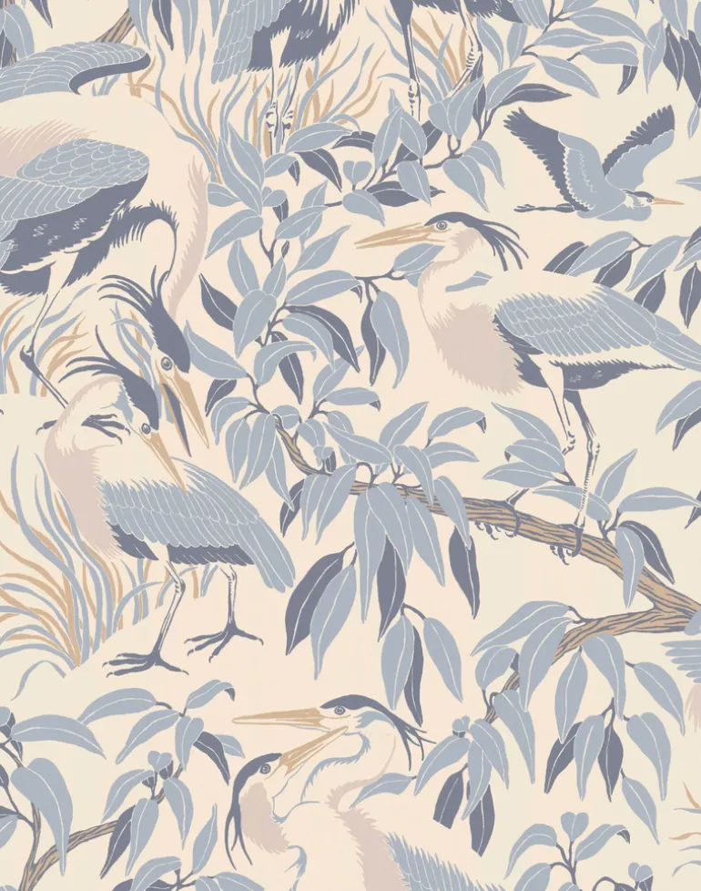 A rhythmic play with formations encouraging the eye to look for the hidden birds in the pattern. The leaves and the graceful bodies of the herons are illustrated by the gentle brush strokes on the paper.