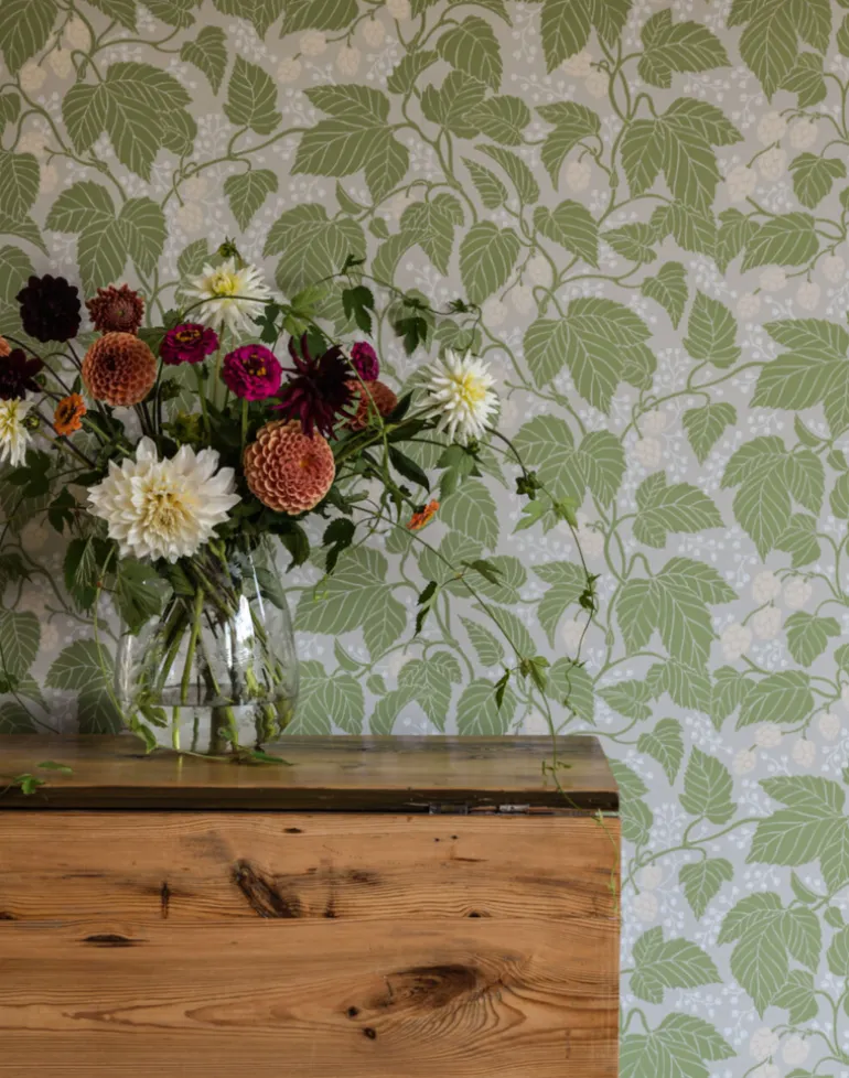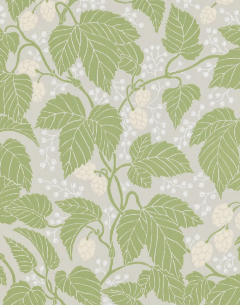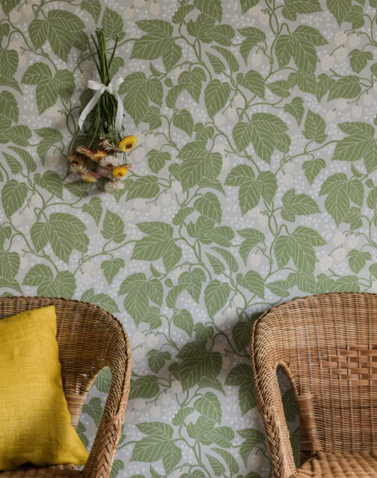 With winding stems, beautiful leaves and flowers, this hop plant winds its way over Emma von Brömssen’s wallpaper Hops and Glory.