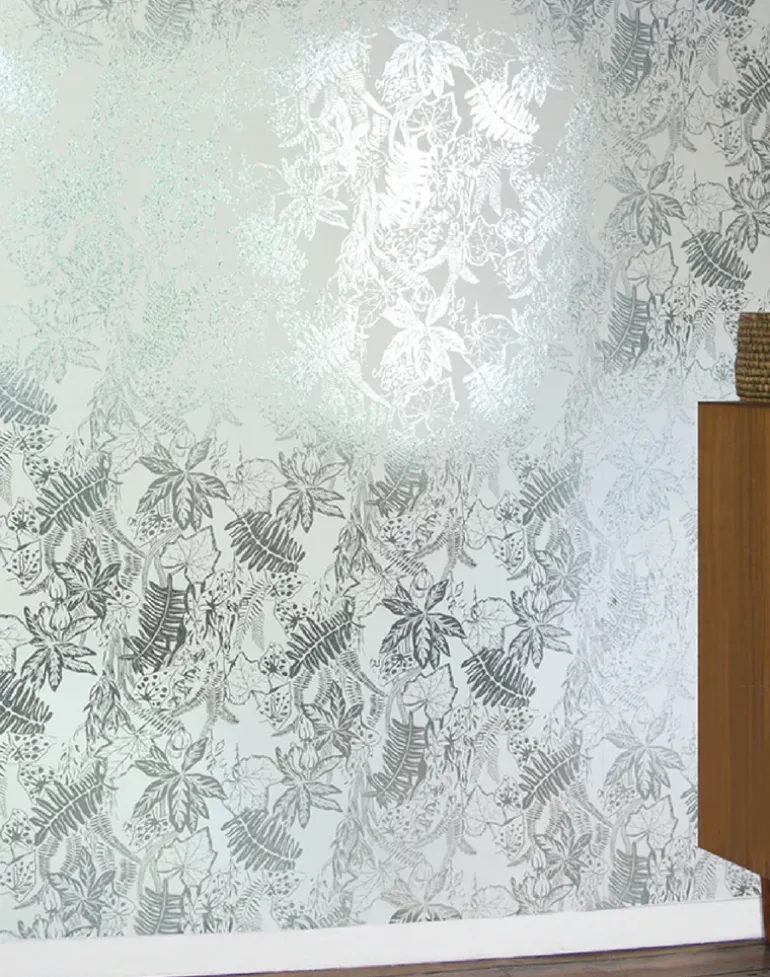 Inspired by the luscious and varied species seen in the heated greenhouses of botanical gardens, Hothouse is a design that captures the true energy of plant life. Cascading ferns, petals and leaves are printed using foils and environmentally friendly pigments to reflect the light and bring any wall to life.