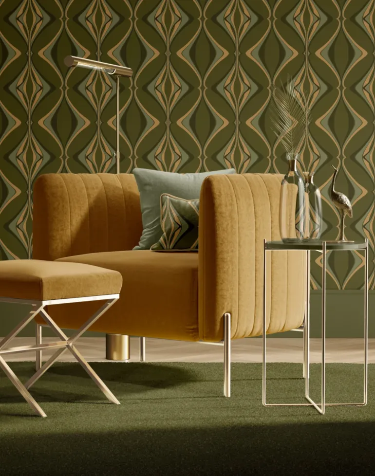 The Hourglass wallpaper is a bold geometric design that combines mid-century inspiration with a modern twist. The repeating hourglass shapes create a rhythmic, flowing pattern that draws the eye, making it a striking choice for feature walls or full-room decoration. Its symmetrical design adds structure while the fluidity of the shapes introduces a sense of movement, perfectly balancing elegance and versatility.