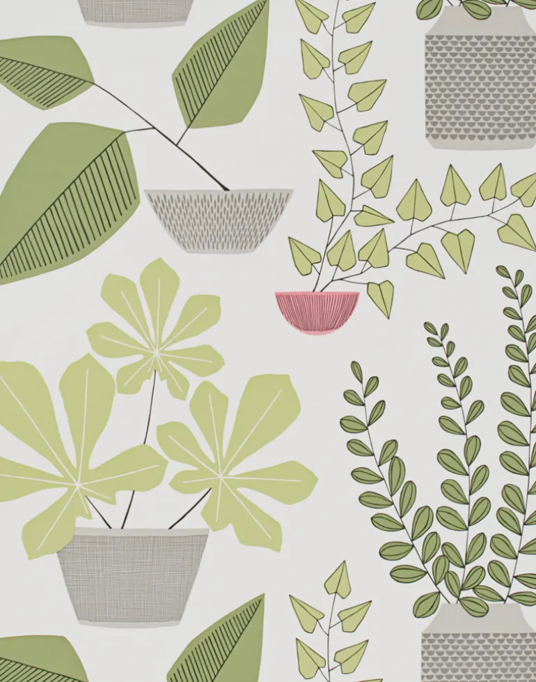 Various shades of green, taupe, and coral illustration on a white background