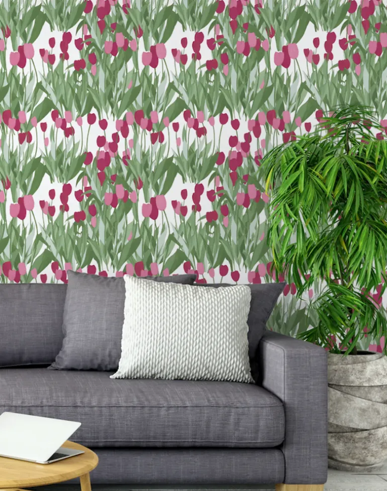 In Bloom features Tulips in gem like pigment hues and zesty greens, a playful pattern bringing joy and freshness creating a contemporary welcoming look.