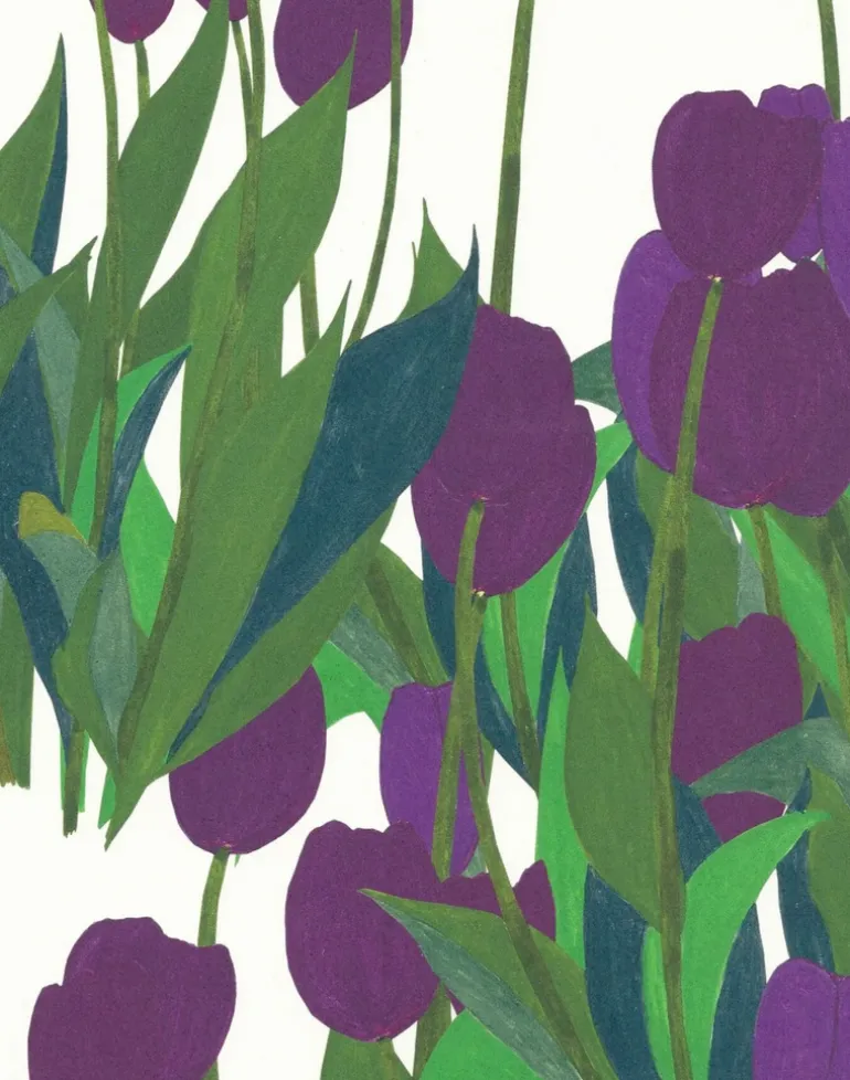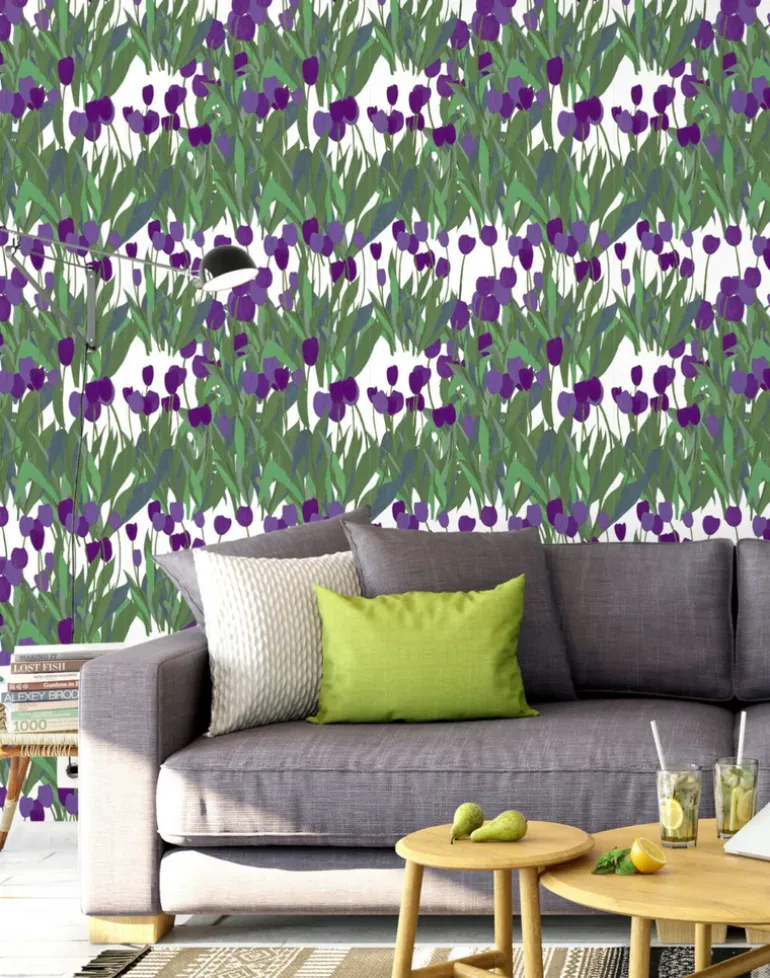In Bloom features Tulips in gem like pigment hues and zesty greens, a playful pattern bringing joy and freshness creating a contemporary welcoming look.