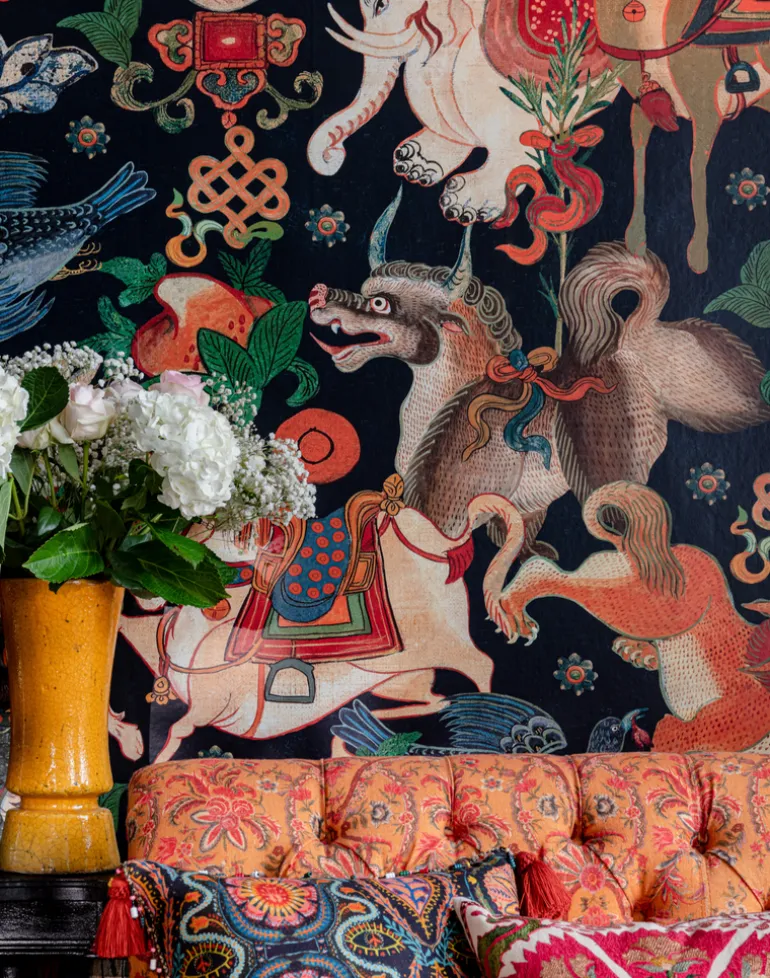 Expect the unexpected in the mystical world of INCANTATION. Where creatures roam freely through an enchanted setting, stay alert as you never know what lies around the corner. Exotic birdlife, ornamented horses and mythical dragon-like animals will surround you, as you wander through gardens filled with striking florae and intricate architectural figures. With backdrops of cream, dark blue and yellow, this vivacious print opens your senses as you imagine a rich, aromatic scent flowing through the air in this fascinating and captivating domain.
