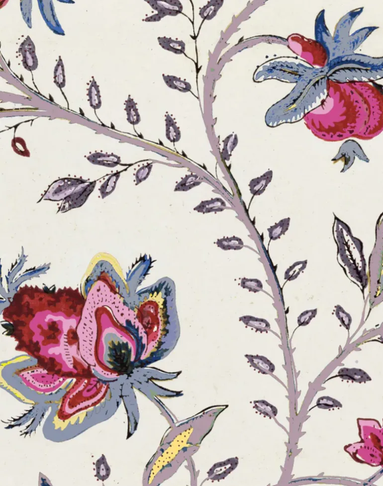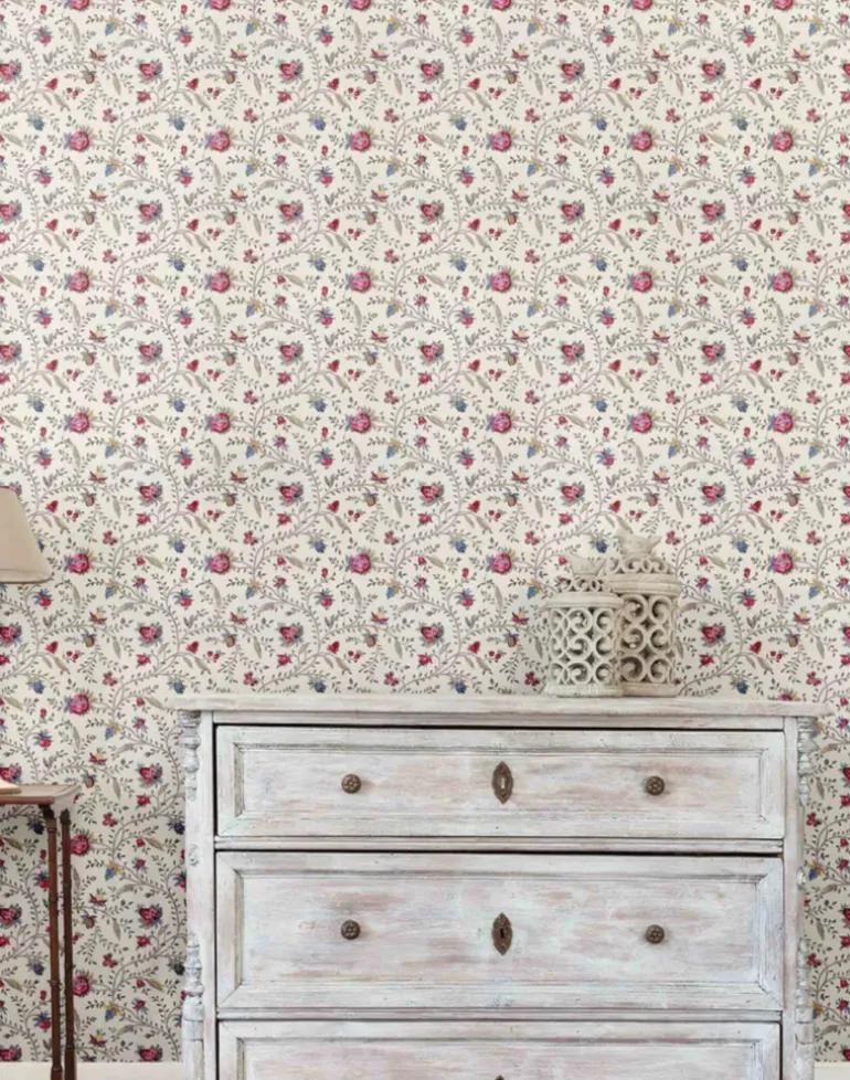 Indienne Petite – a feminine, bohemian, floral wallpaper that is full of life. This wallpaper design has an abundance of colours to work into the interior design scheme of a room – including pinks, blue, yellows and taupe – which makes it especially fun to decorate with. It fills a room with abundance and joy making it a wonderful bedroom, drawing room, entrance hall, guest room wallpaper. In fact there are no limits to the use of this wallpaper as it will literally spread joy wherever it goes.
