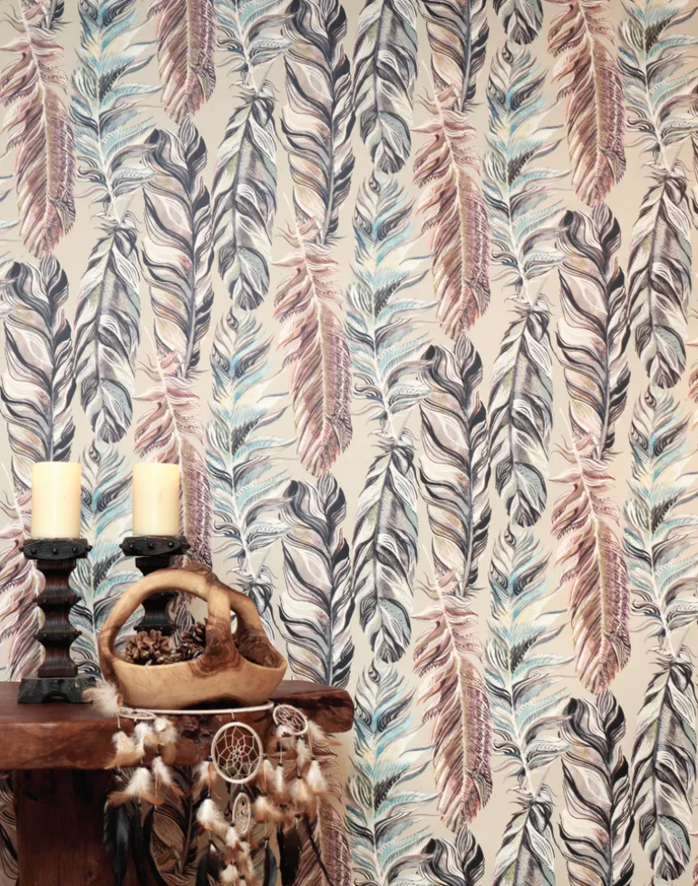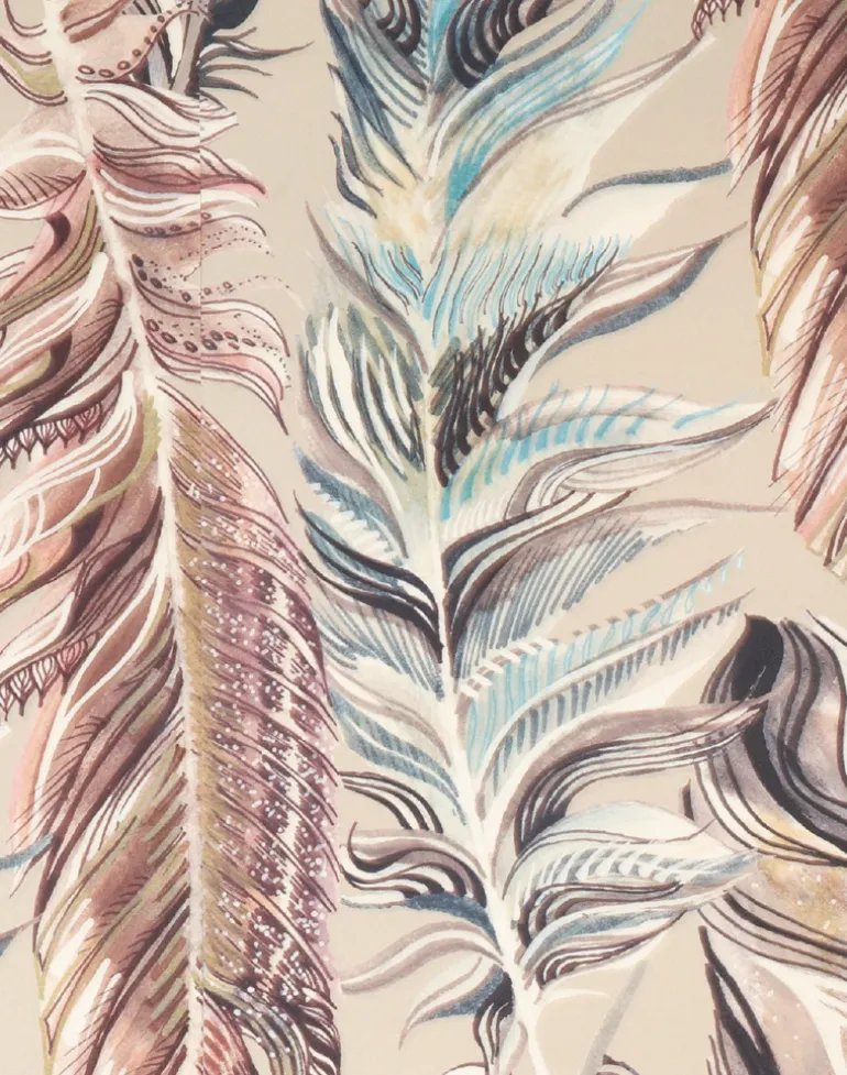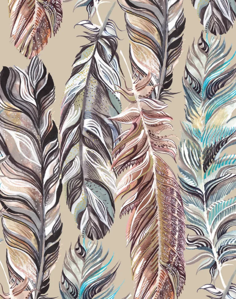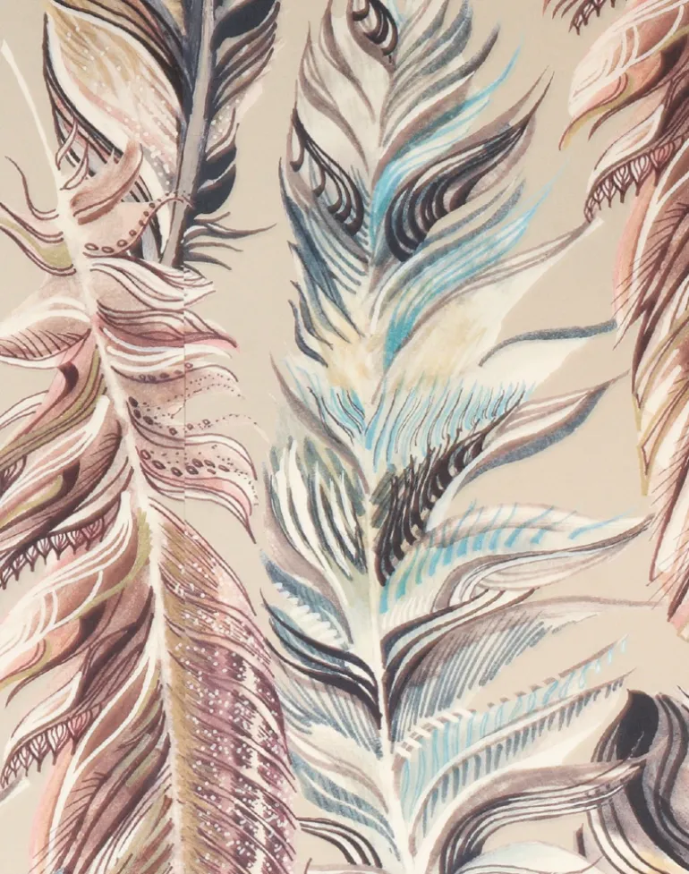 Digitally printed repeat wallpaper of four hand illustrated and painted feathers.