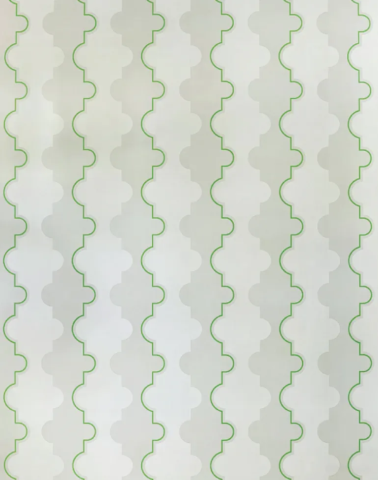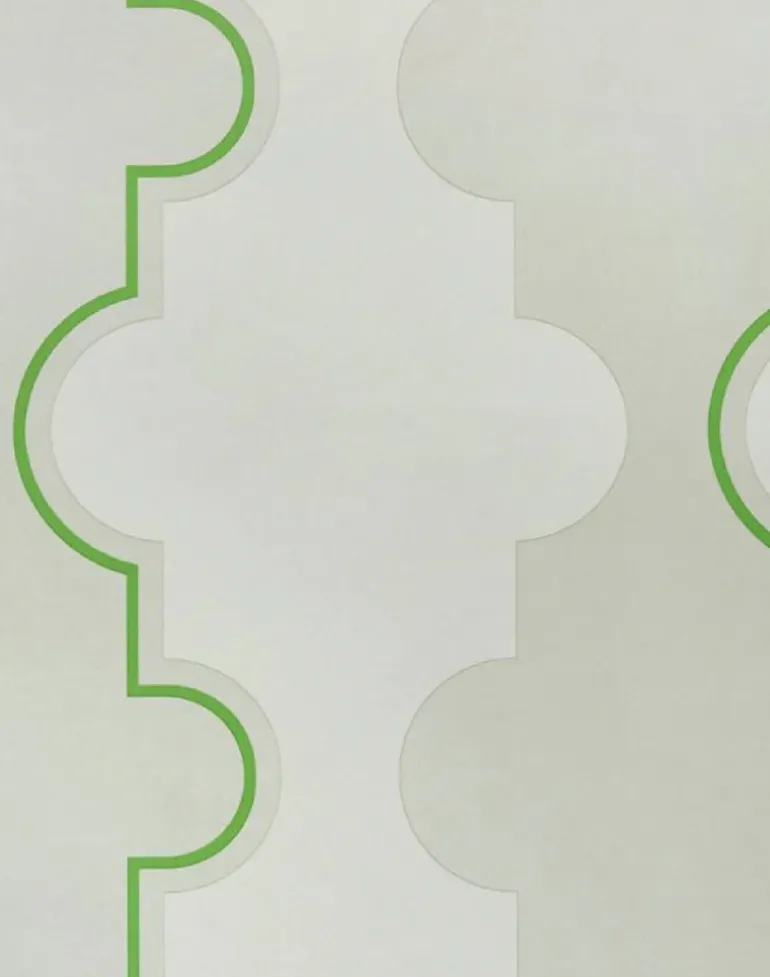 This fabulous large scale geometric stripe features a soft stone jigsaw print punctuated with a pop of color. Available in bright pink or green on stone.