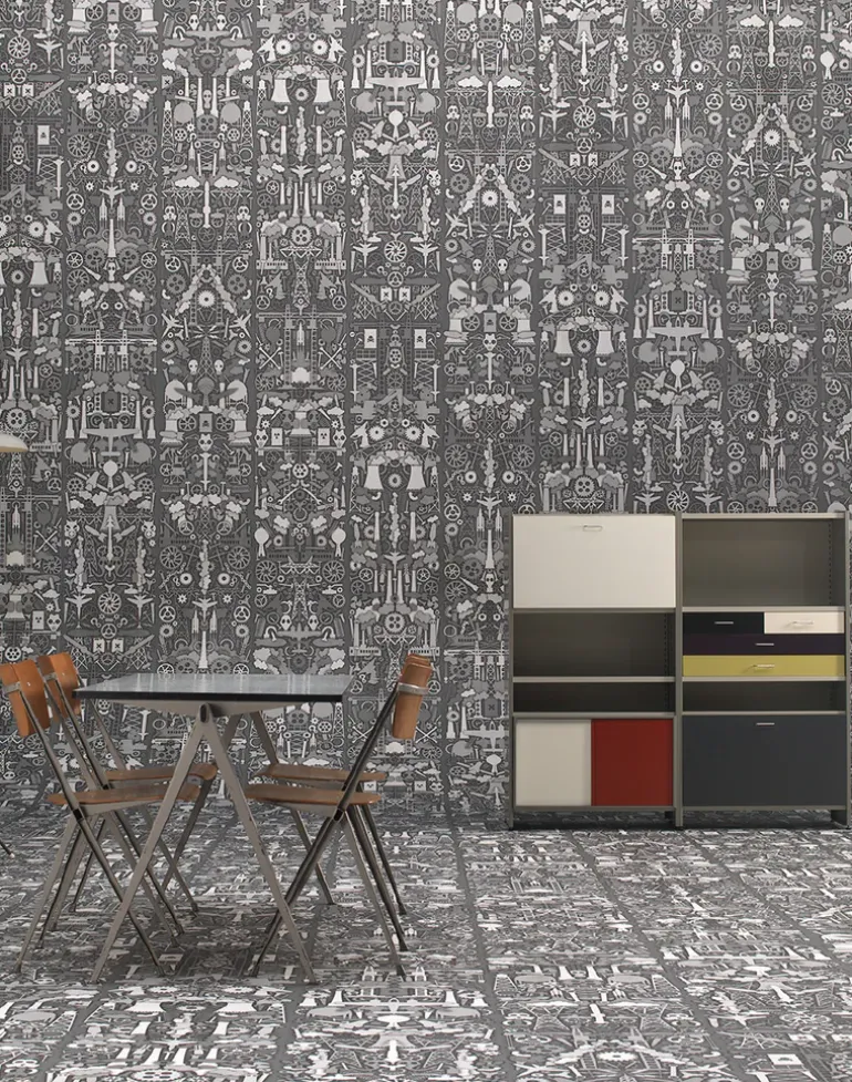 7 Designs from the library of Job Smeets and Nynke Tynagel of Studio Job were selected for the collection “Archives Wallpaper by Studio Job”. The collection reflects a retrospect of the history of Studio Job. They used archetypal drawings and these universal symbols are combined as iconographic elements for patterns, compositions and embossing, ultimately creating 6 designs.