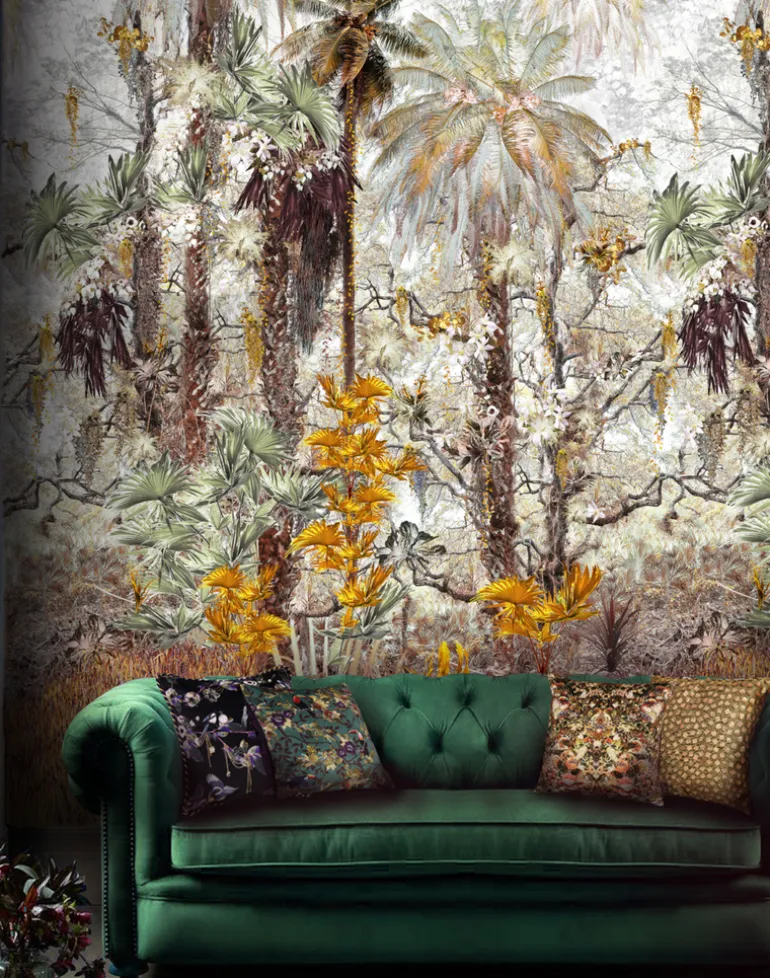 The Jungle Mural pattern is part of the Tropical State of Mind collection, inspired by the vibrant flora and fauna of tropical climates. Rich colors are key and bringing a tropical feeling in every home