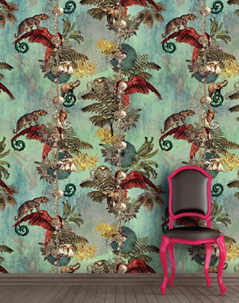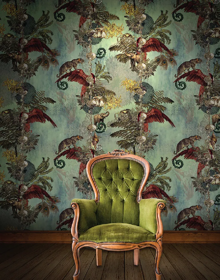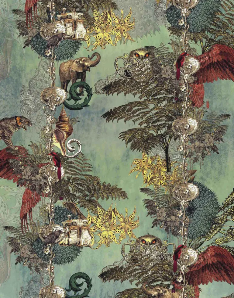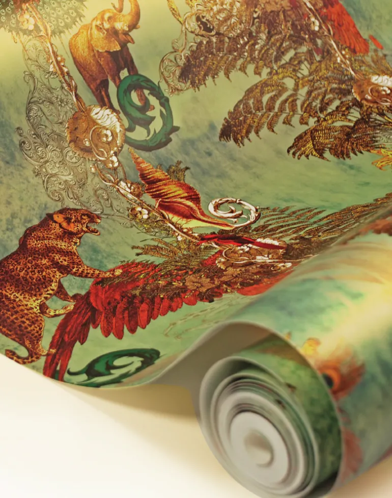 This grand design features ascending vines of imperial creatures amongst ferns and palms. A soft gold-metallic finish enhances the stunning imagery to set a scene of embellished colonial nostalgia. Printed on unique gold iridescent paper, the beautiful burnished finish will gleam with gold as it catches the light.