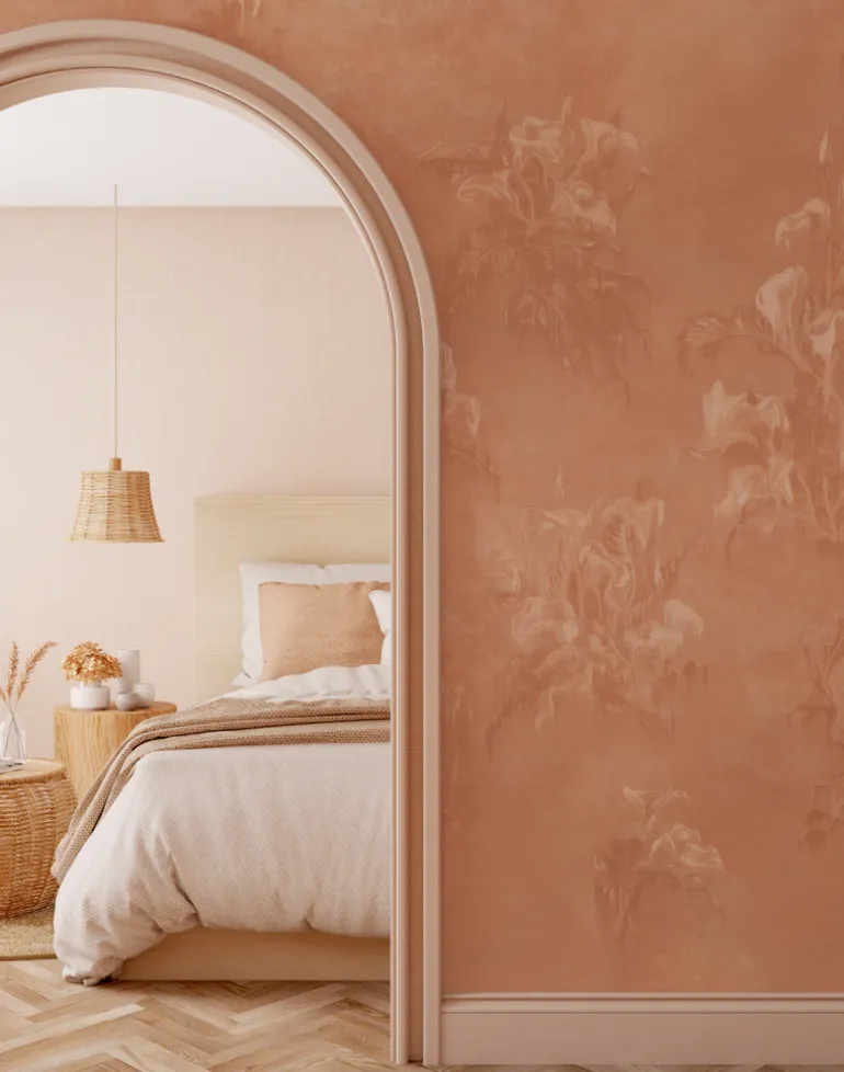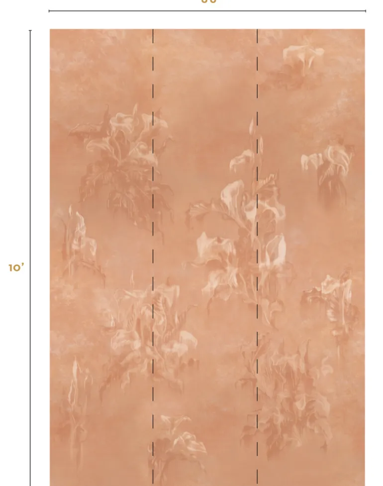 You know that too-good-to-be-true-effect when the Venetian plaster starts to break away and the layers of lovely old wallpaper begin to peak through those rich textures? That’s the inspiration the Kelsi wallpaper mural. Drawings of giant calla lilies wash in and out of a painted plaster finish to create this moody but wildly versatile mural. The mural repeats horizontally every 6’6” or every 3 panels. One “roll” includes three, 26” wide by 10’ tall panels.