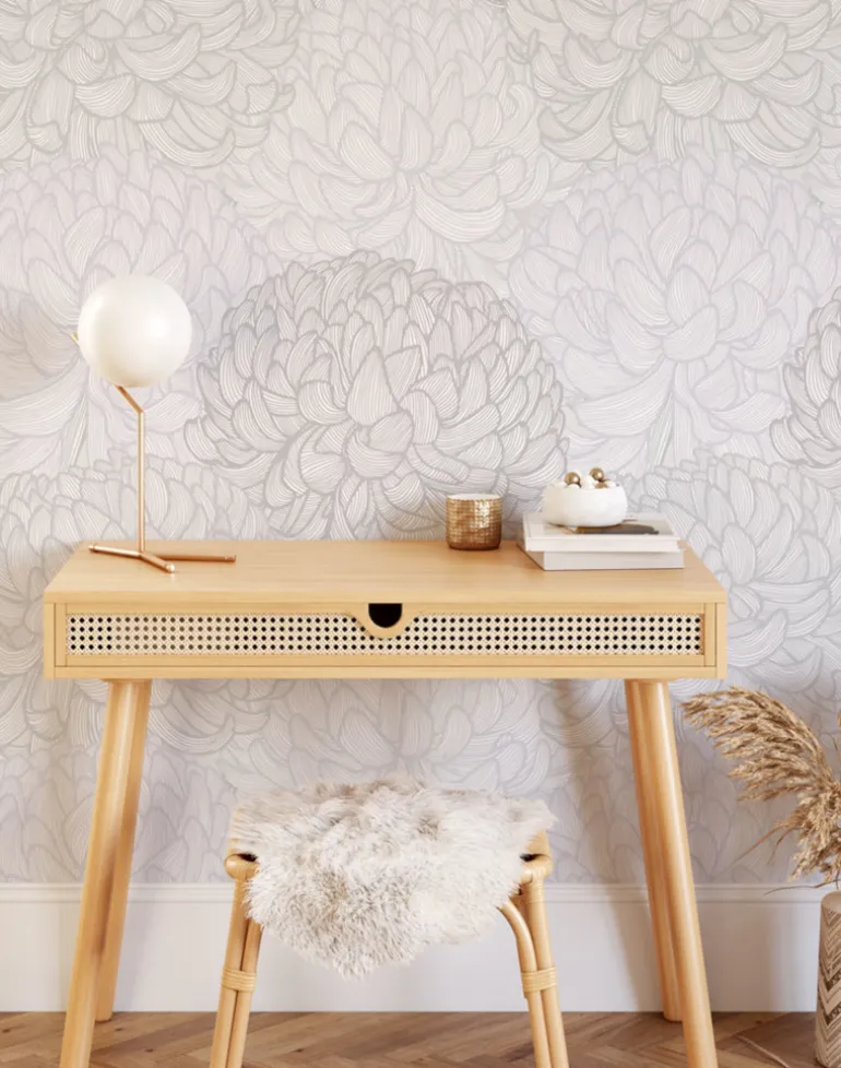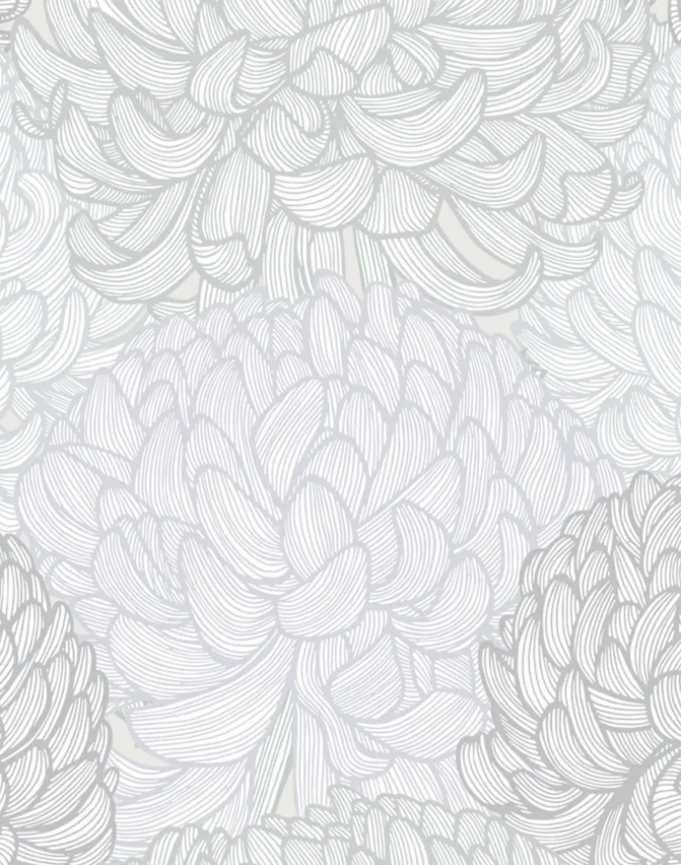 As a Wallpaper and Textile designer, I draw inspiration from the beauty around me and I could not go past the magnificence of the Japanese Kiku Chrysanthemum. My Kiku design incorporates multiple flower illustrations depicting the many-layered petals. Kiku design from Patricia Braune’s Tranquil Lines Collection.