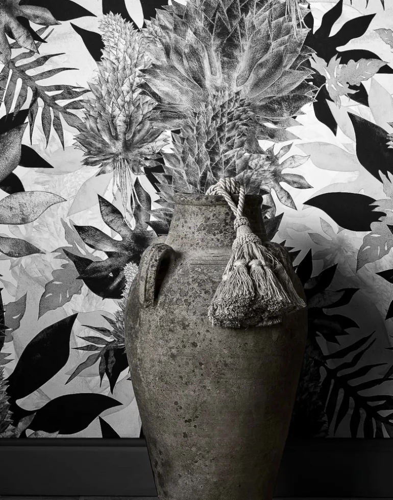 Reminiscent of a bygone era, Kimolia is a breath-taking collection of botanical wallcoverings. Set across a dramatic 55″ horizontal repeat, this majestic paradise blends faded vintage hues and decadent fibrous textures, with a fresh contemporary perspective. Taking its name from the Greek word for Chalk (Kimolía), this 17 Patterns collaboration with Athens based artist, Christina K, and British designer; Nosca Inc, skillfully crafts individual hand-cut foliage with delicate chalk shading into beautiful layers of fictional forestry. Digitally produced in four tranquil habitats of Paradise Green, Tobacco, Ocean Blue and Black.