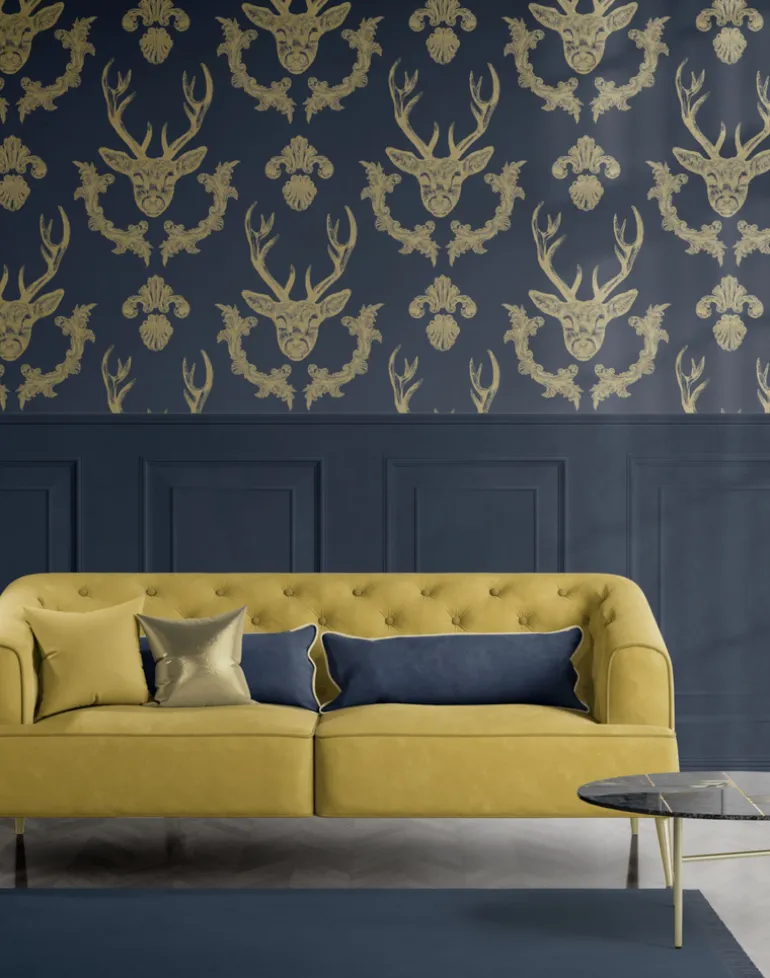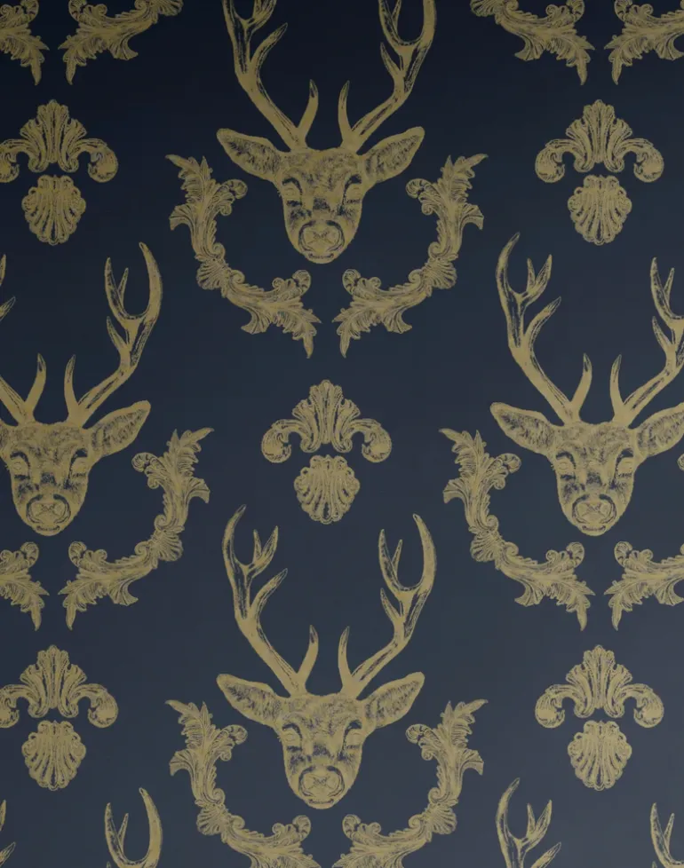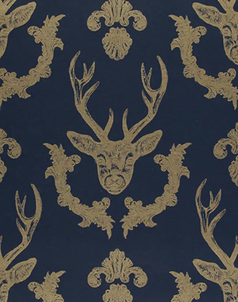 A wonderful wallpaper design by Laura Garner celebrating the mighty King of the Wood. Featuring a charming illustration of a majestic stag, hand drawn in her signature style, framed by shimmering golden filigree. Set upon a dark blue background, this stylish and sophisticated wallpaper is a modern and contemporary twist on the traditional country style which will look stunning in a rural retreat or city living space.