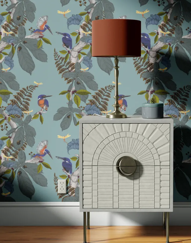 Our beautiful wallpaper is printed in Australia using our striking contemporary hand-drawn designs. The featured design is inspired by the Azure Kingfisher easily recognizable with a combination of brightly colored feathers, royal-blue plumage on its upperparts contrasting with orange on its underparts.