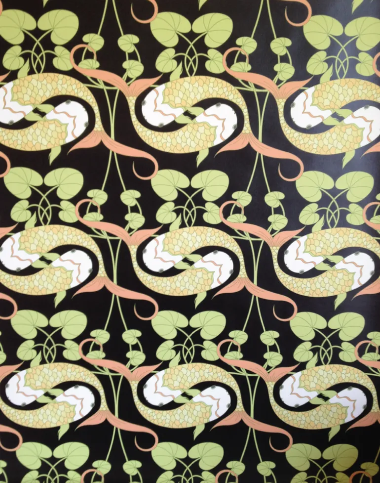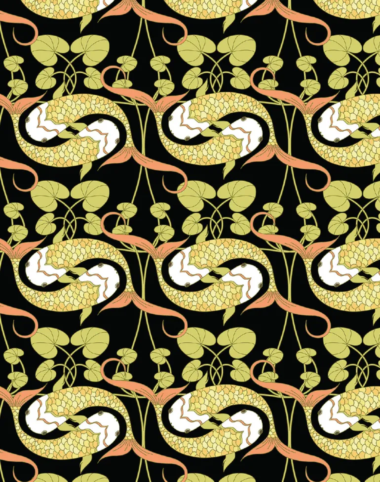 Designed by Judit Gueth, the Koi Chinoiserie Matte wallpaper features two intertwining koi fish.