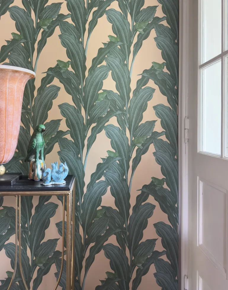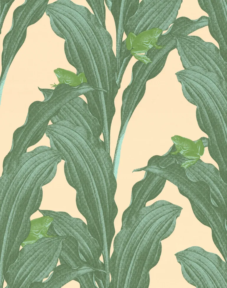 Kool Kermit is a feast for the eyes. This wallpaper provides a harmonious and enchanting color scheme with its attractive, big leaves and the fashionable frog hidden in the foliage. The plants on the wallpaper twist and turn like a stripe. The designer Lisa Bengtsson, recognized for her affection for animals, has now cast the frog in the leading role. Are you aware that the frog has been chosen as the animal of 2024?